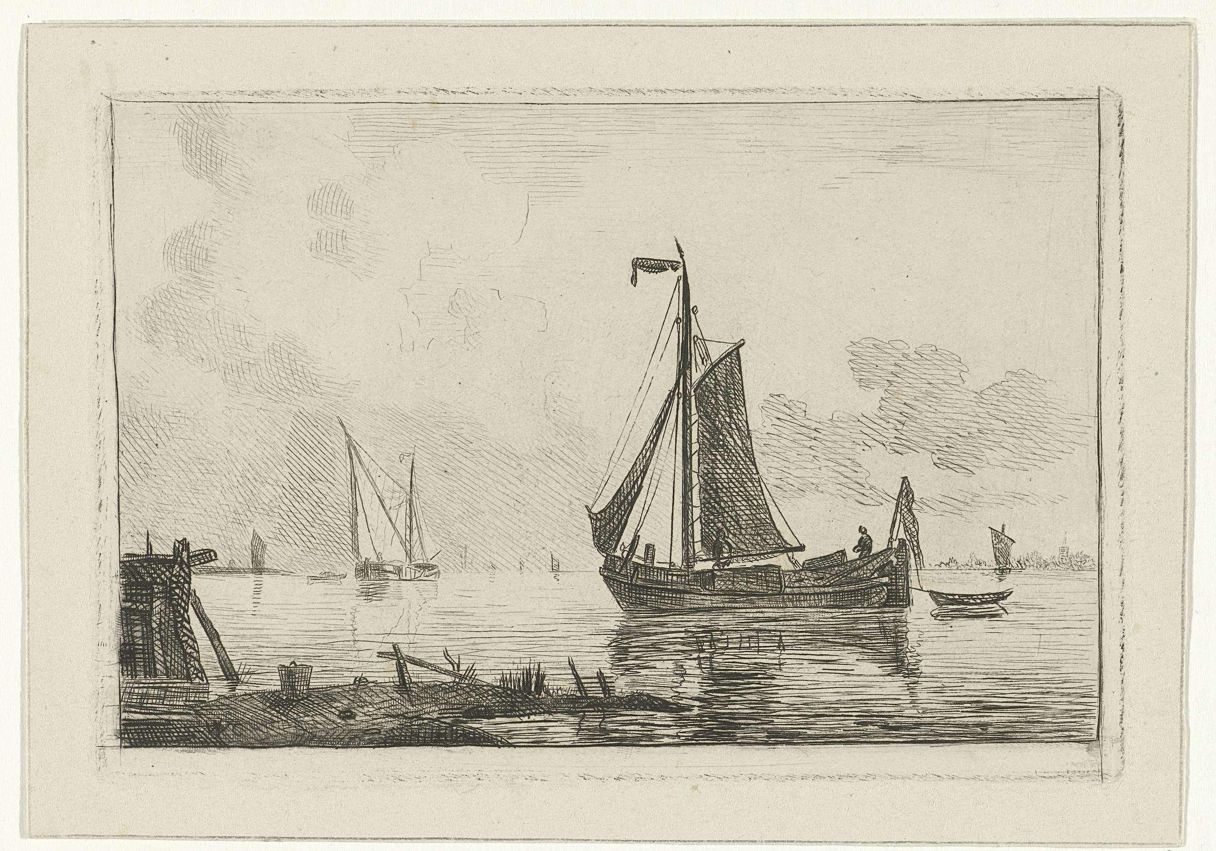 Riviergezicht met zeilschip op de flank gezien. Links een pier.