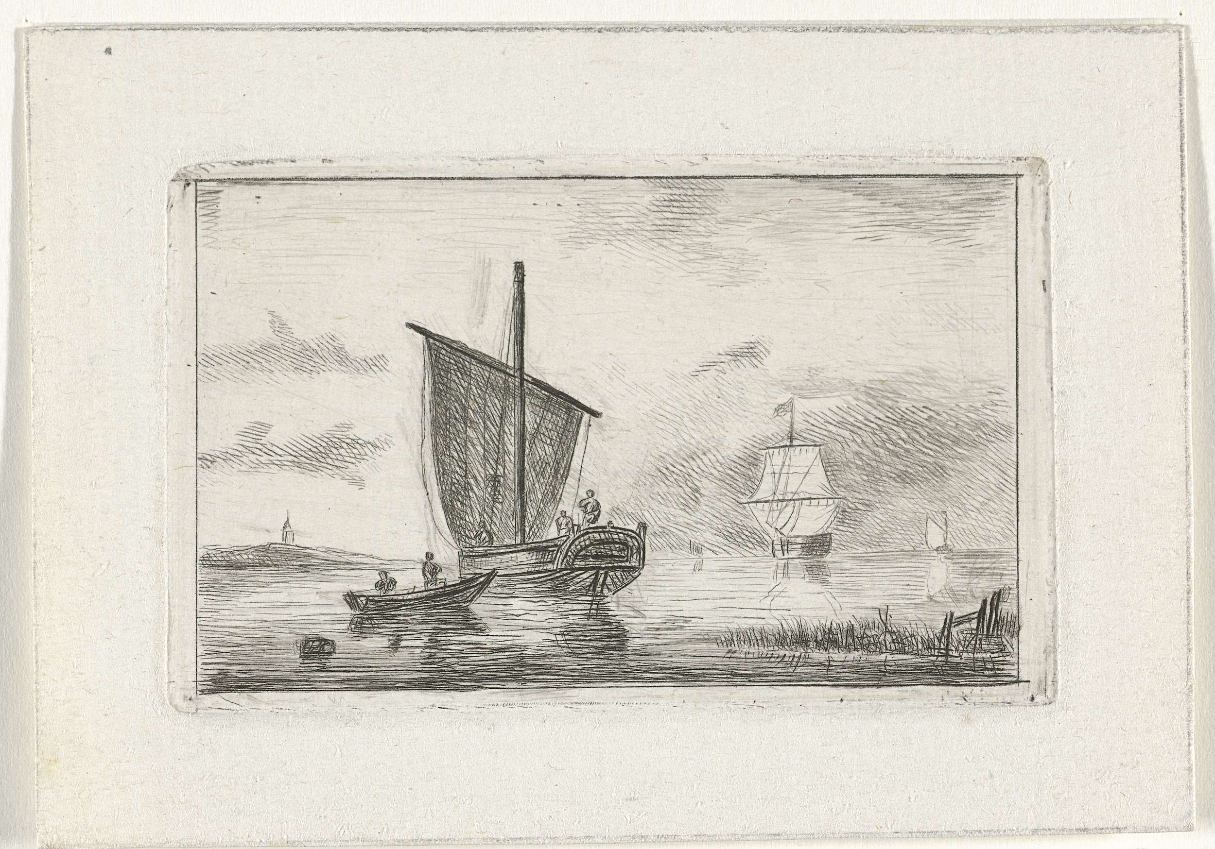 Riviergezicht met zeilschip, van achteren gezien, en een roeiboot.