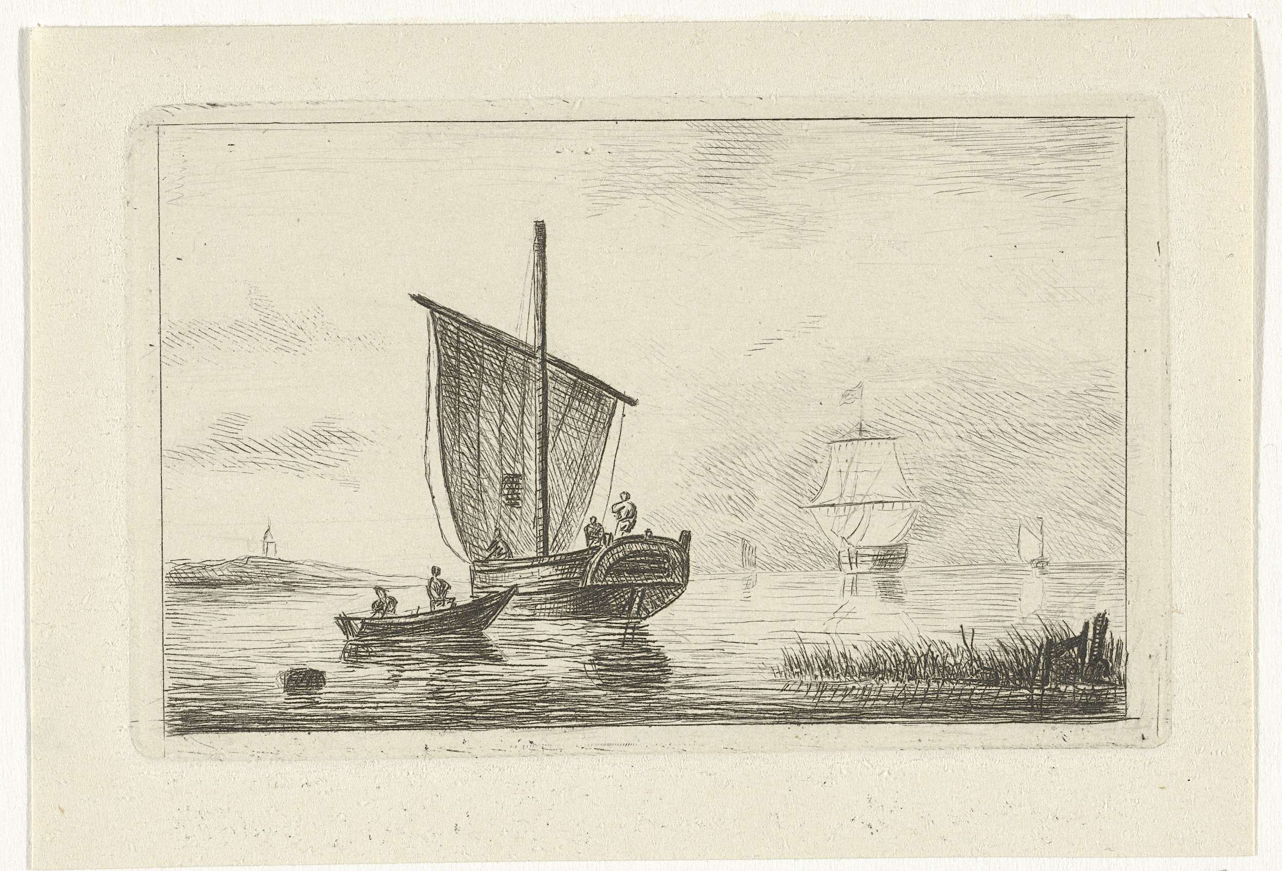 Riviergezicht met zeilschip, van achteren gezien, en een roeiboot.