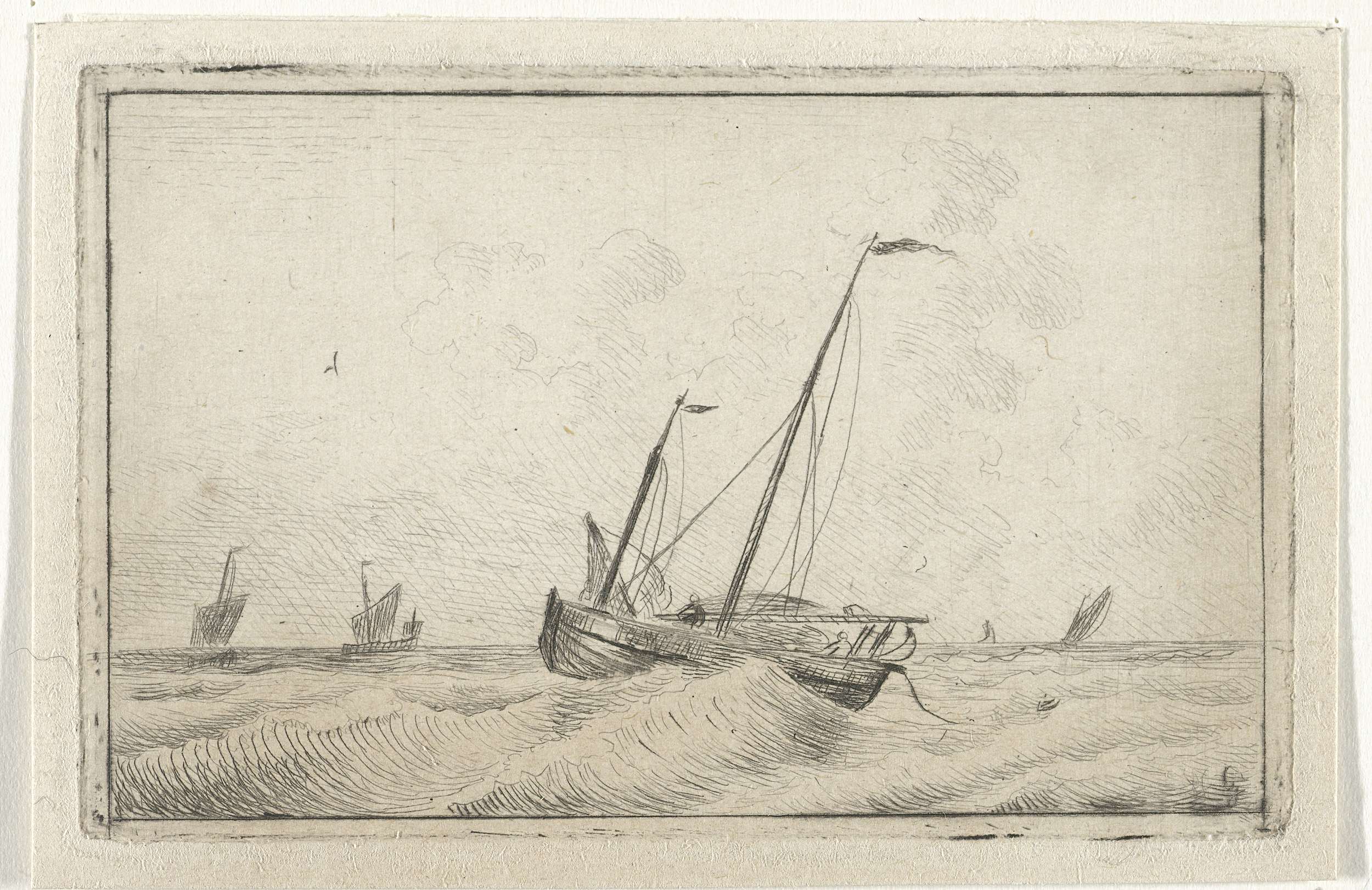 Een schip in woelig water met scheepjes op de achtergrond.