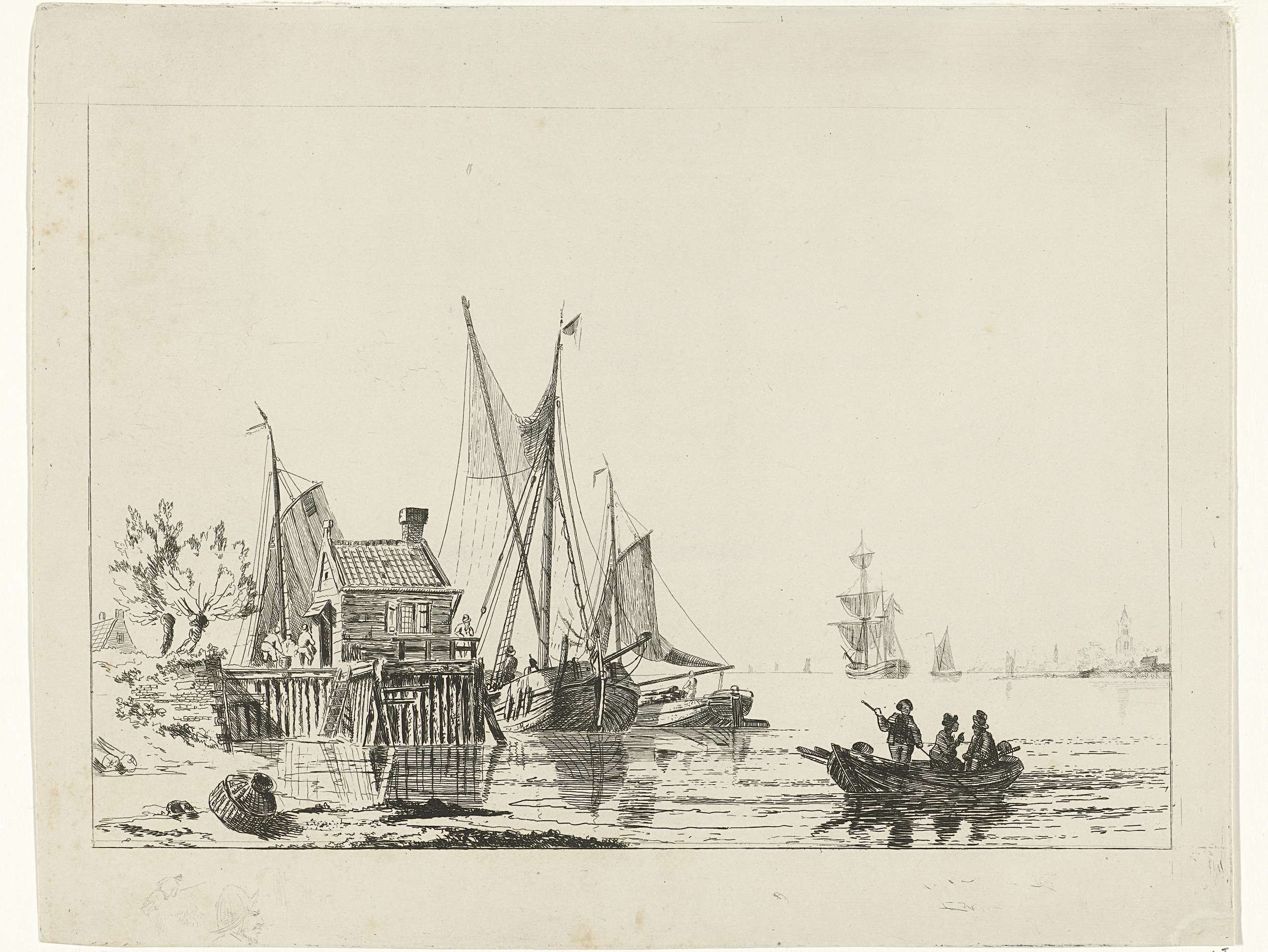 Houten huis bij een pier met aangemeerde zeilschepen en rechts op de voorgrond een roeiboot met drie mannen erin. Links onder de voorstelling twee schetsmatig geëtste figuren.