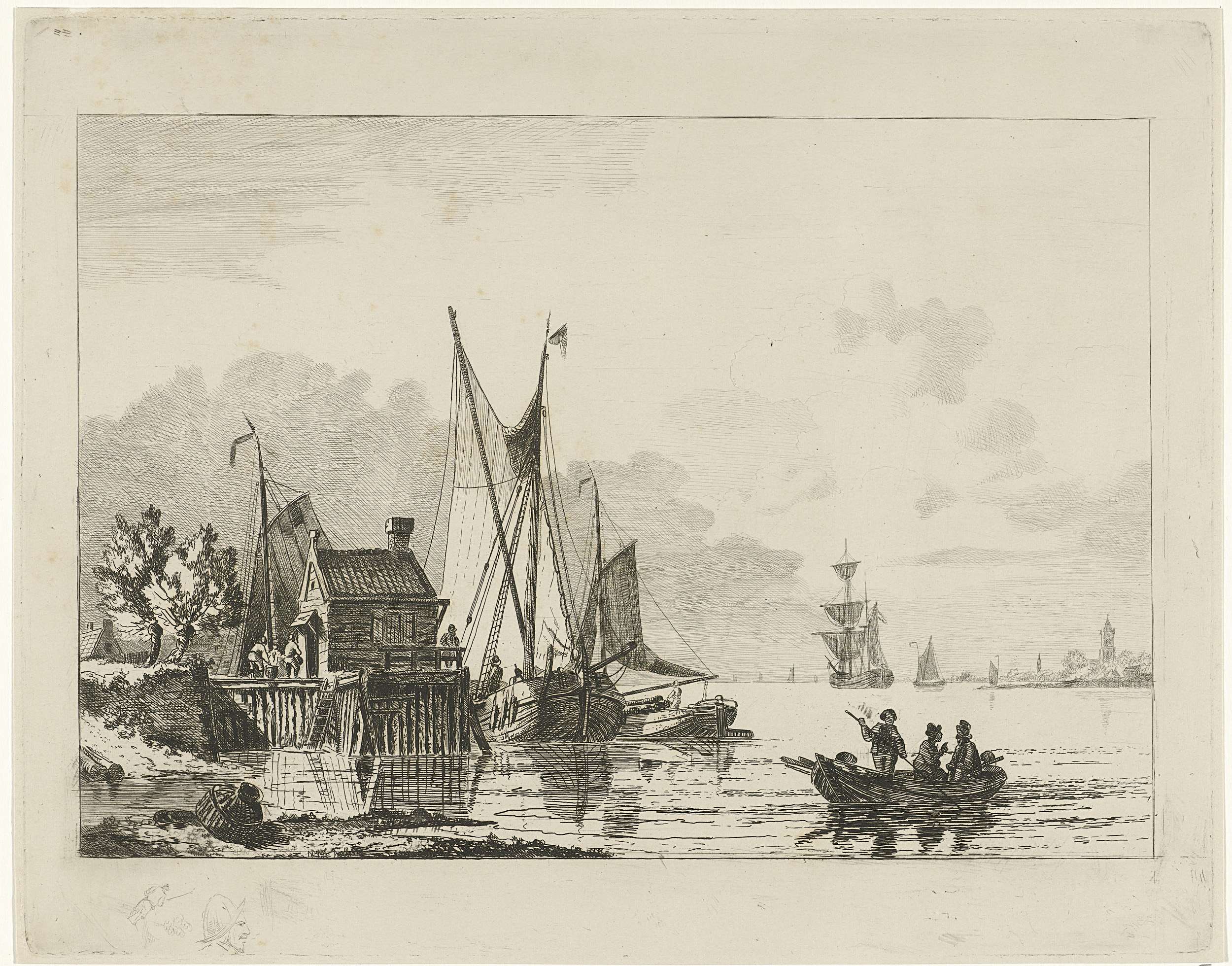 Houten huis bij een pier met aangemeerde zeilschepen en rechts op de voorgrond een roeiboot met drie mannen erin. Links onder de voorstelling twee schetsmatig geëtste figuren.