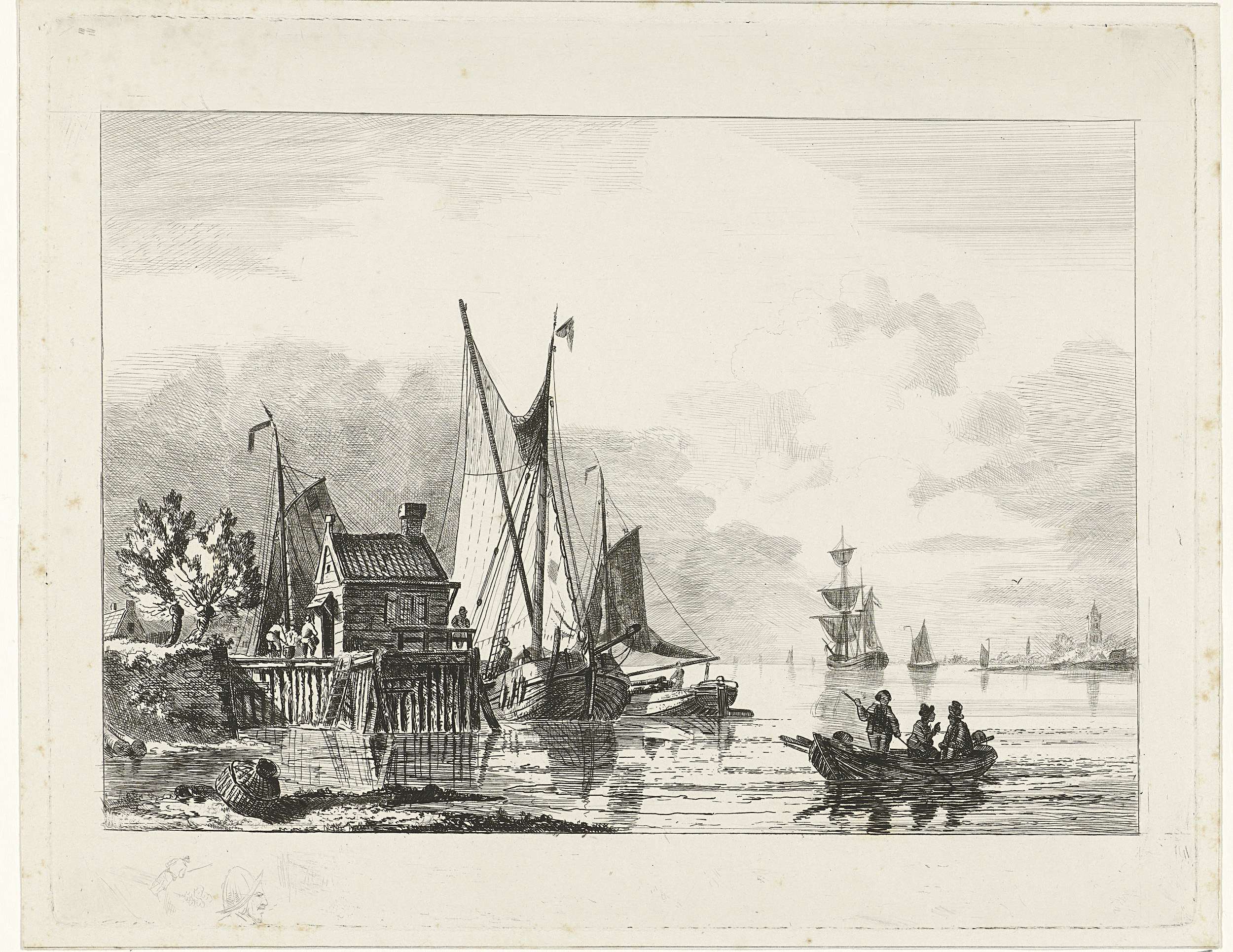 Houten huis bij een pier met aangemeerde zeilschepen en rechts op de voorgrond een roeiboot met drie mannen erin. Links onder de voorstelling twee schetsmatig geëtste figuren.