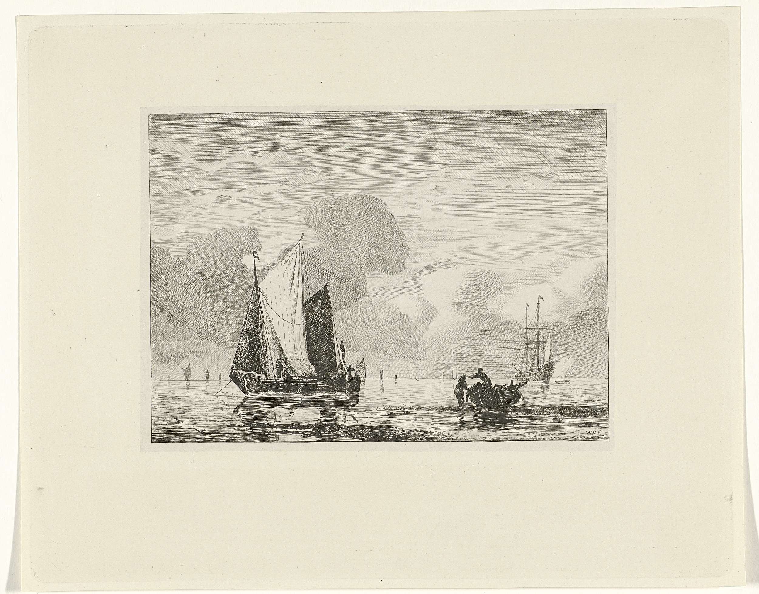Zeegezicht met op de voorgrond een aangemeerd zeilschip op de flank gezien, rechts twee mannen die uit een roeiboot stappen.