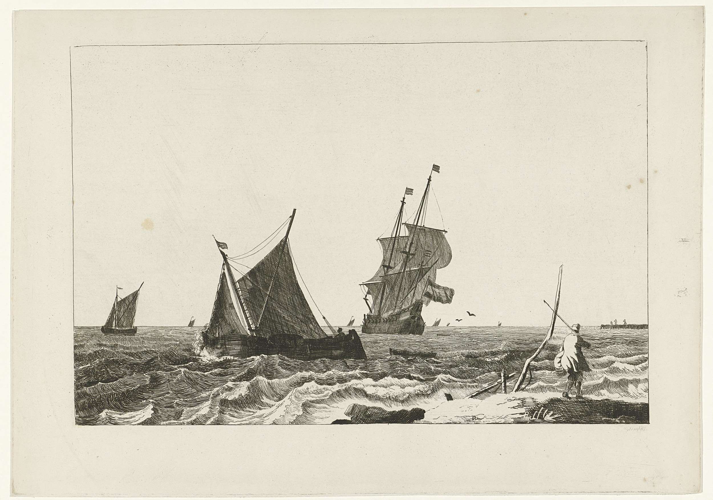 Zeegezicht met enkele zeilschepen, waaronder een tweemaster, bij sterke wind. Rechts op de voorgrond een man met een stok over zijn schouder. Rechts onder de voorstelling staat de signatuur van de prentmaker in spiegelbeeld. Prent naar een schilderij van Ludolf Bakhuysen.