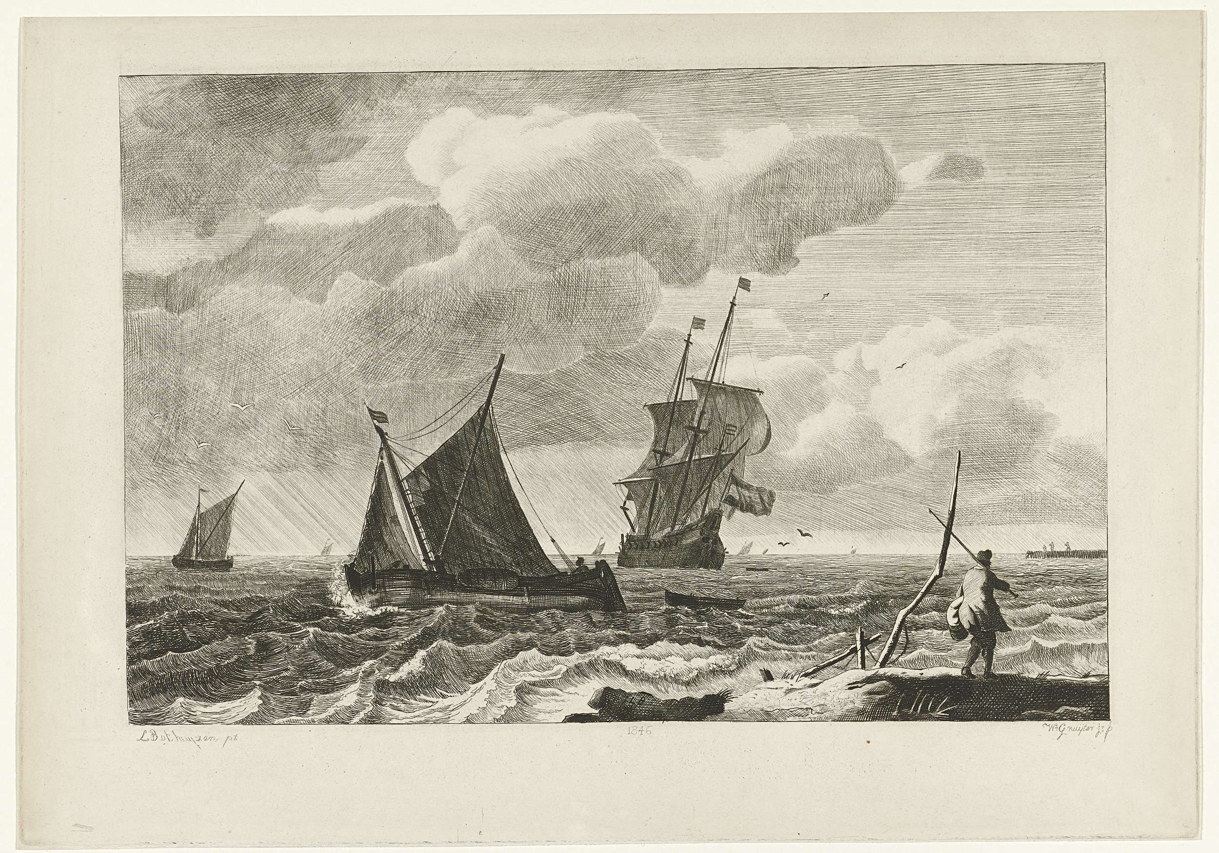 Zeegezicht met enkele zeilschepen, waaronder een tweemaster, bij sterke wind. Rechts op de voorgrond een man met een stok over zijn schouder. Op rots middenvoor staan de initialen van de schilder. Prent naar een schilderij van Ludolf Bakhuysen.