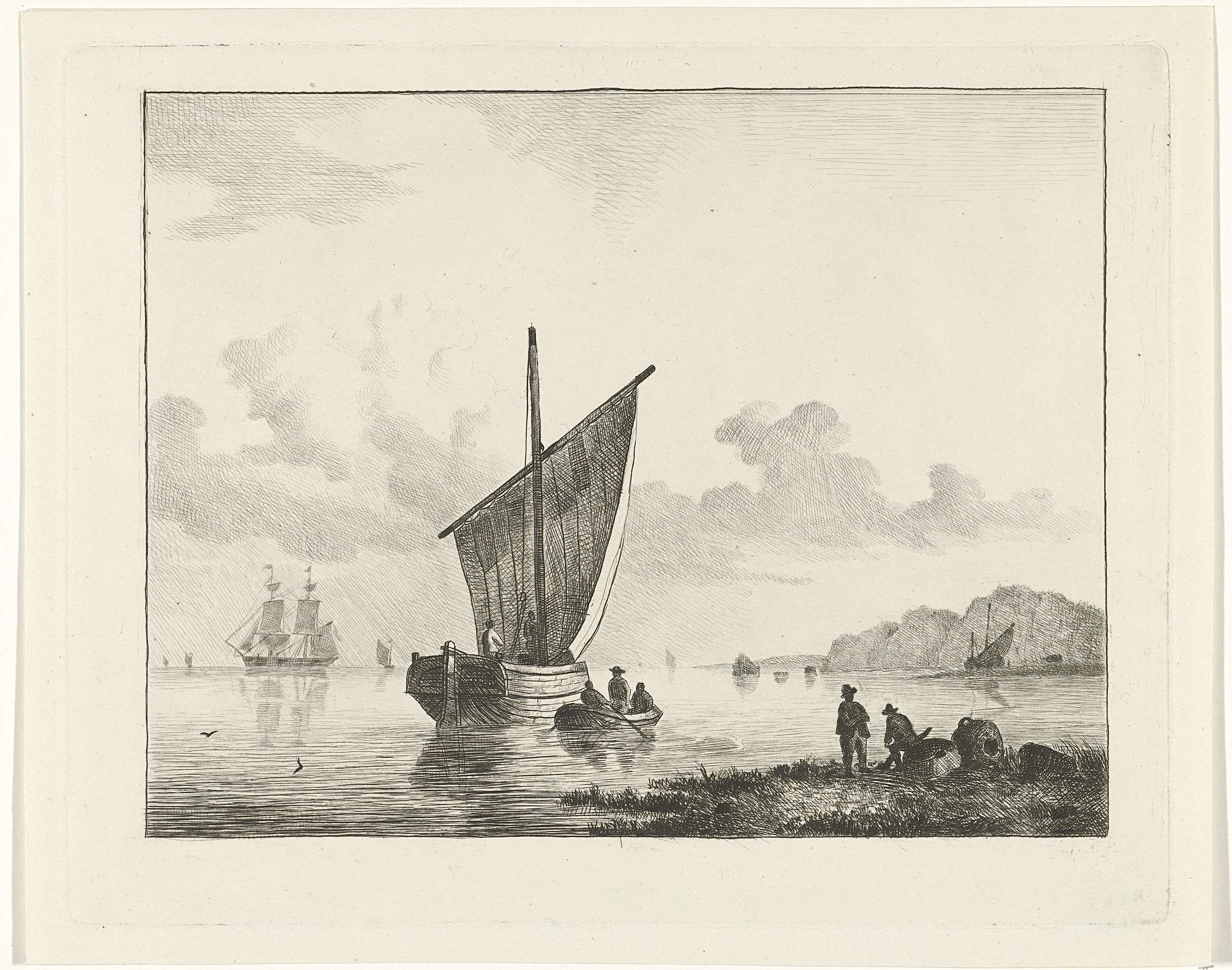 Zeilschip aan de kust en een roeiboot met drie figuren. Op de voorgrond twee mannen aan wal.