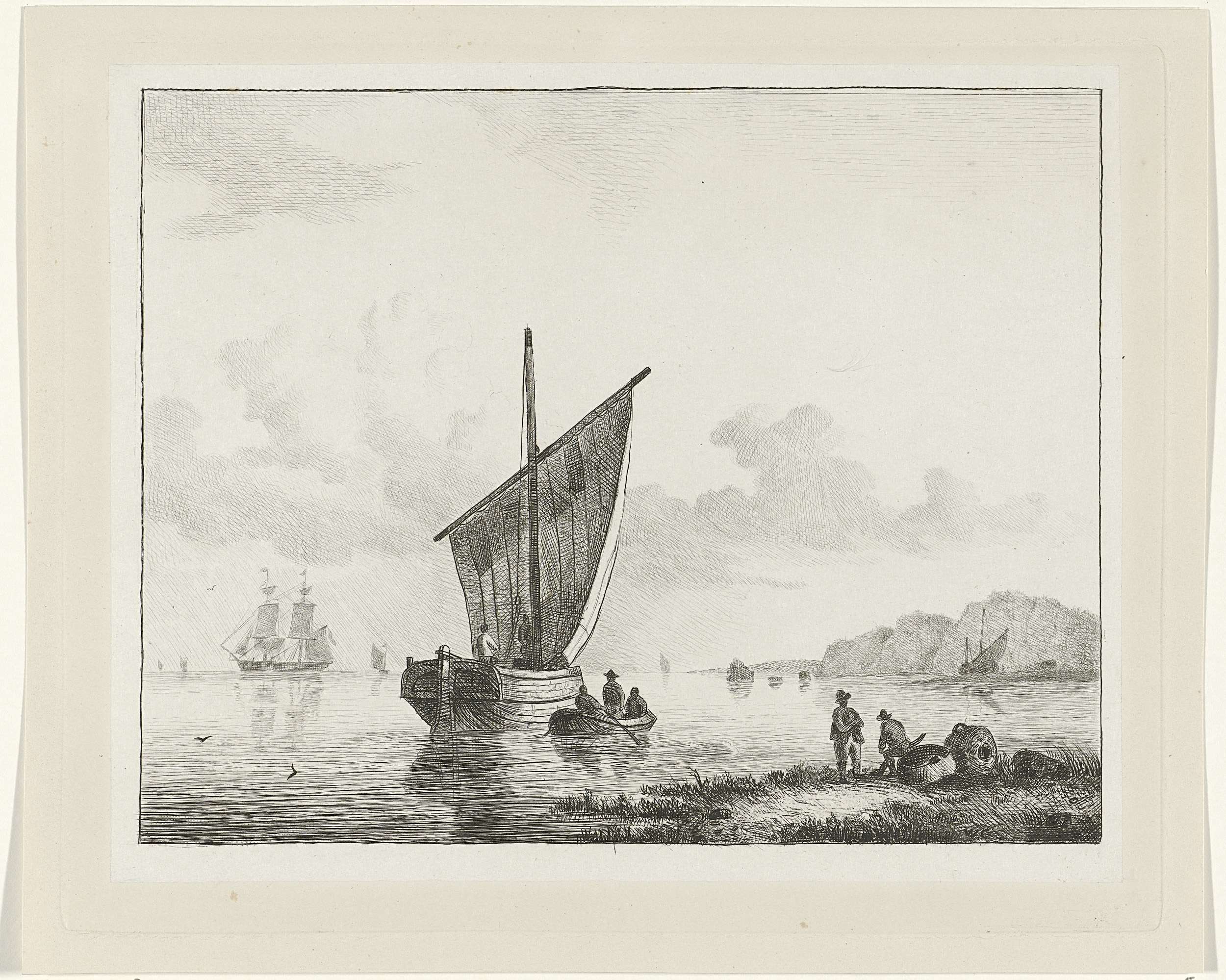 Zeilschip aan de kust en een roeiboot met drie figuren. Op de voorgrond twee mannen aan wal.