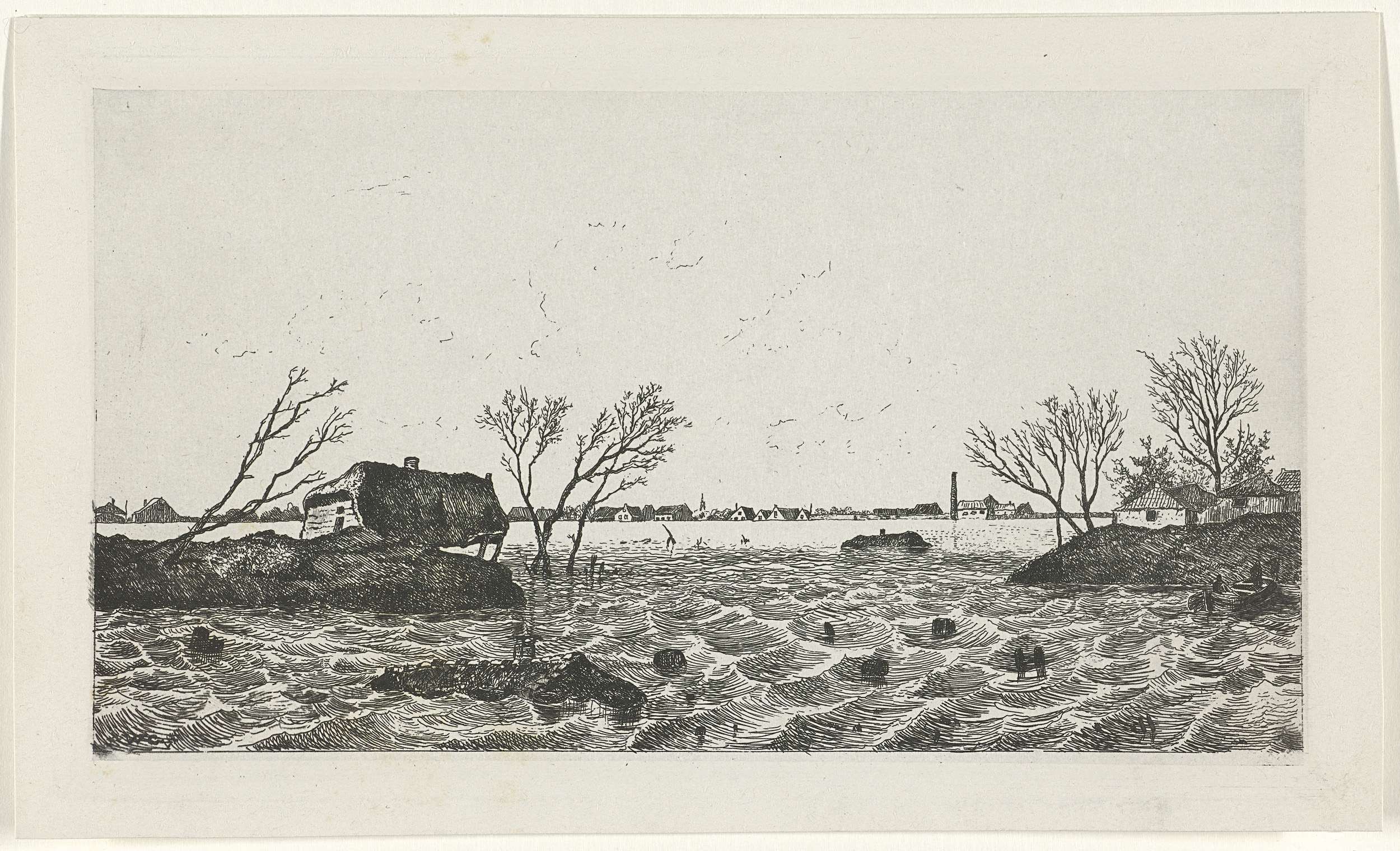 Landschap met dijkdoorbraak bij Dreumel tijdens de watersnoodramp in 1855.