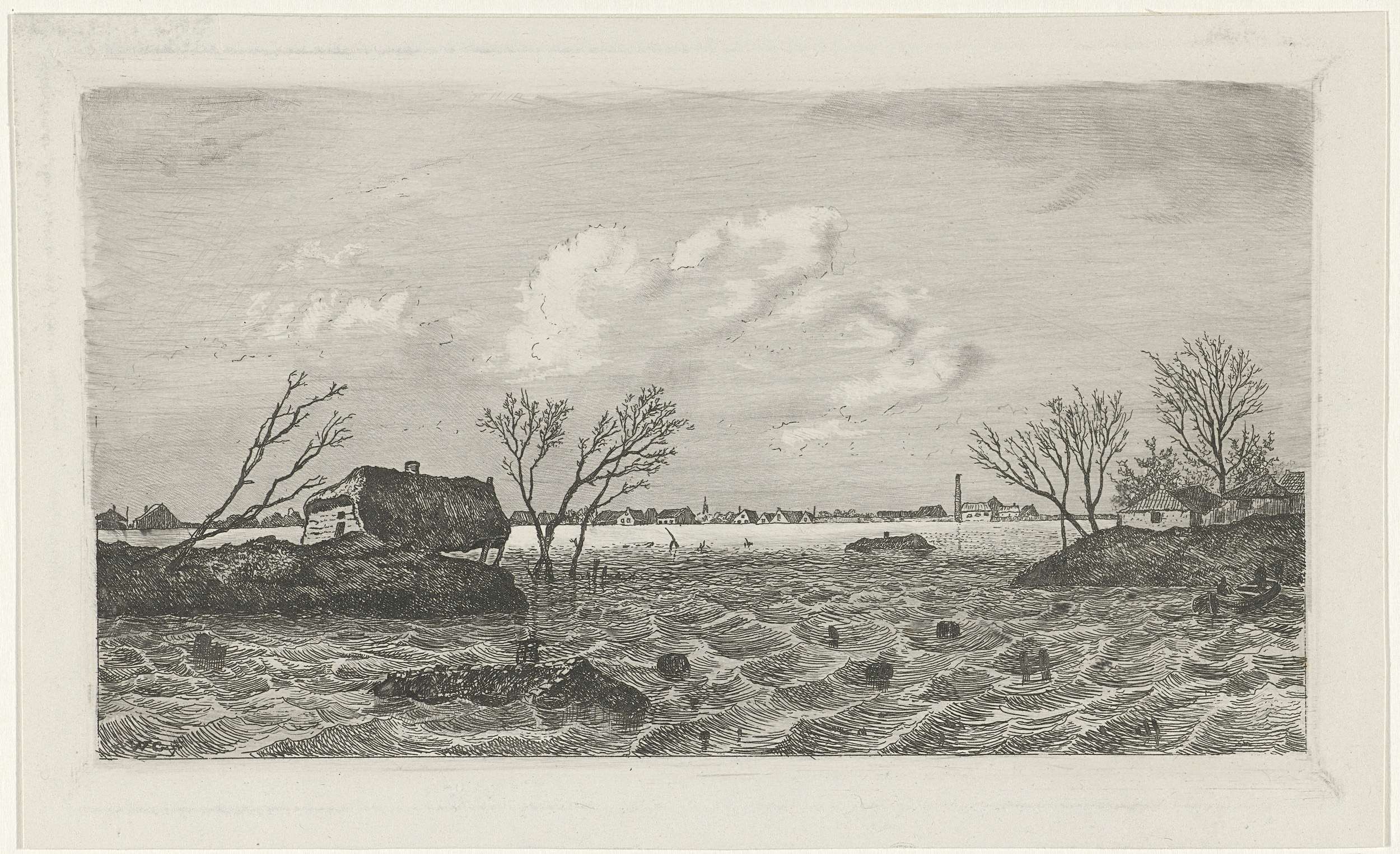 Landschap met dijkdoorbraak bij Dreumel tijdens de watersnoodramp in 1855.