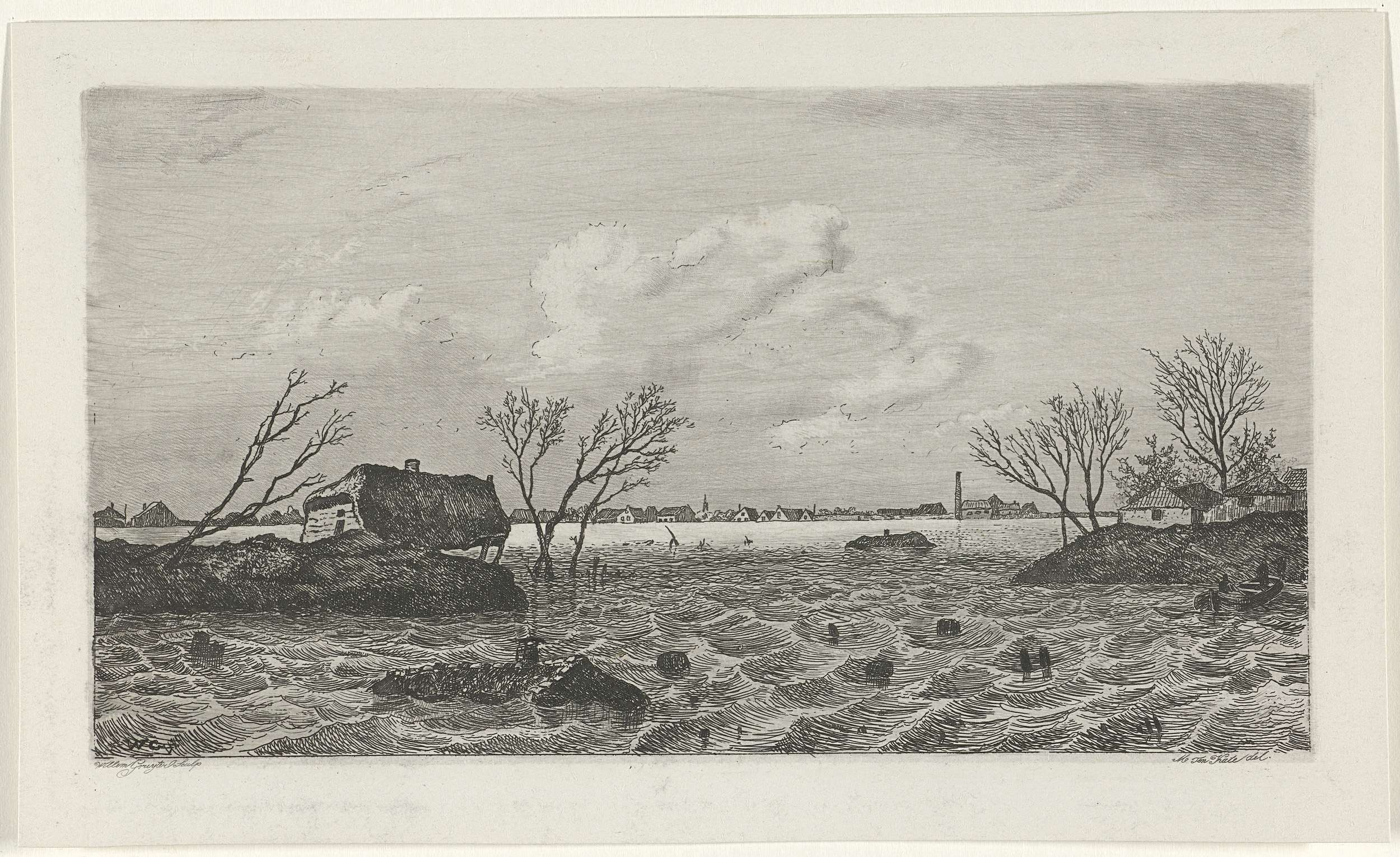 Landschap met dijkdoorbraak bij Dreumel tijdens de watersnoodramp in 1855.