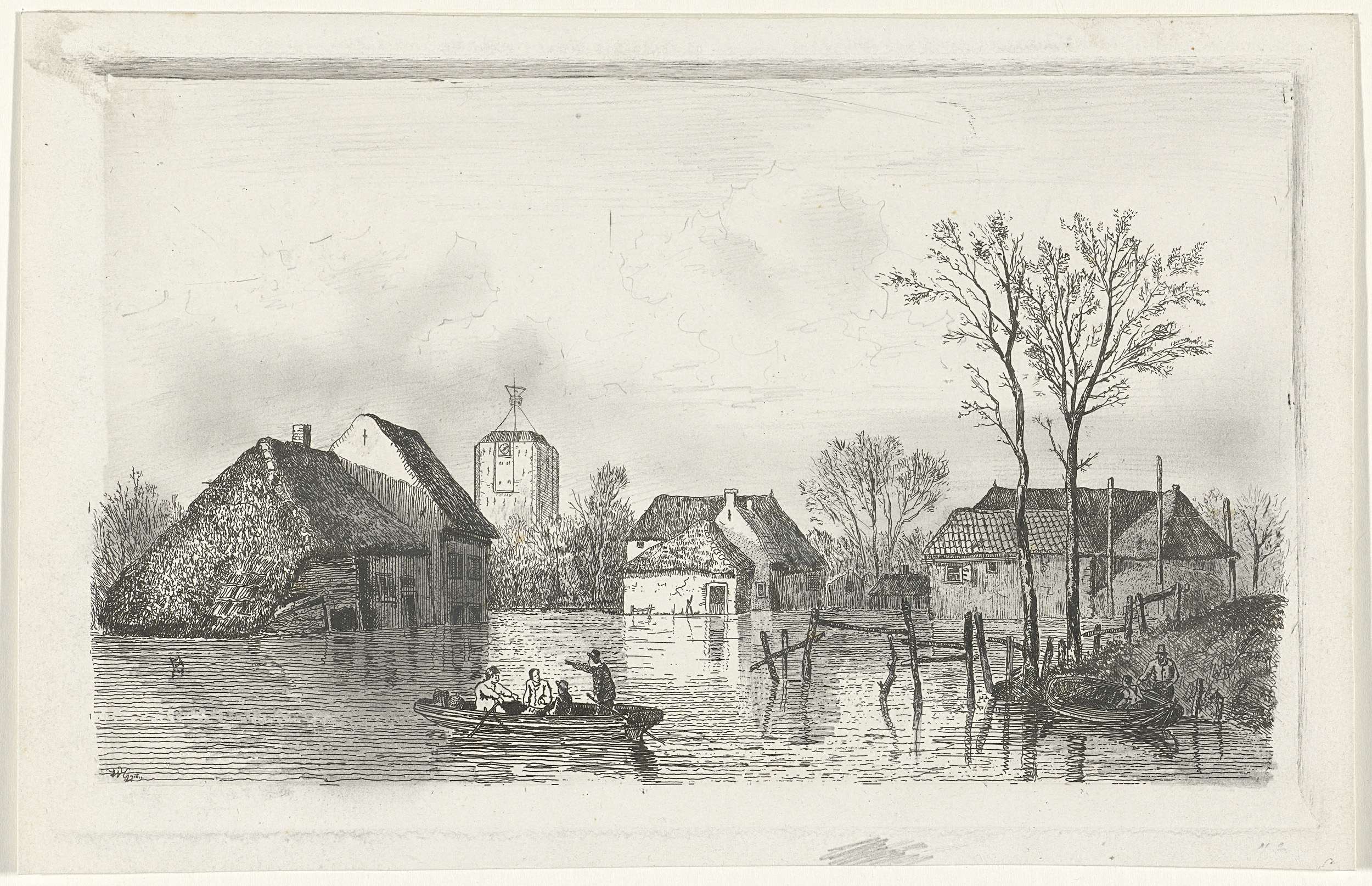 Landschap met overstroming bij Beesd in 1855. Op de achtergrond zijn ondergelopen boerderijen en de kerktoren van Beesd zichtbaar.