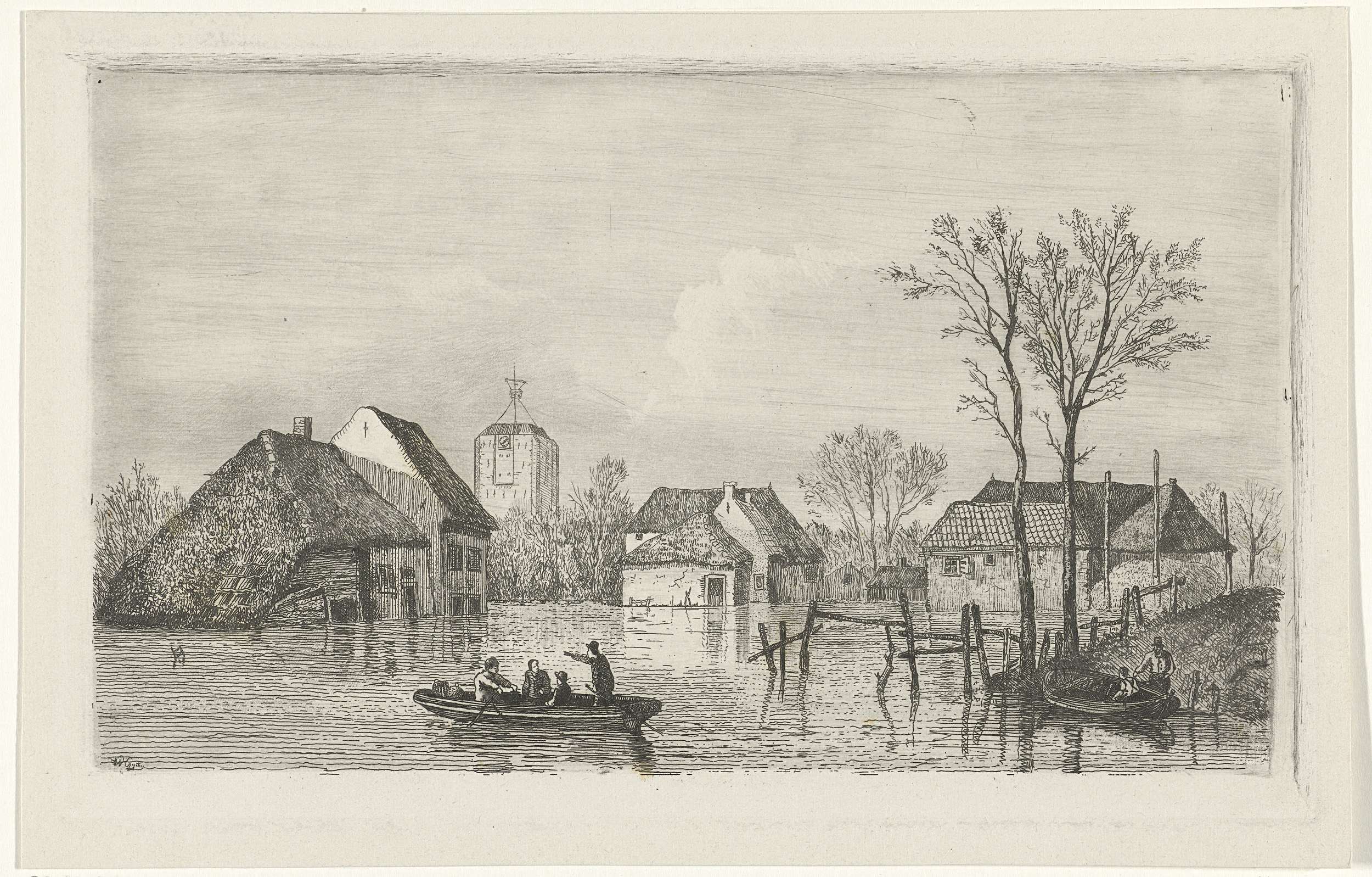 Landschap met overstroming bij Beesd in 1855. Op de achtergrond zijn ondergelopen boerderijen en de kerktoren van Beesd zichtbaar.