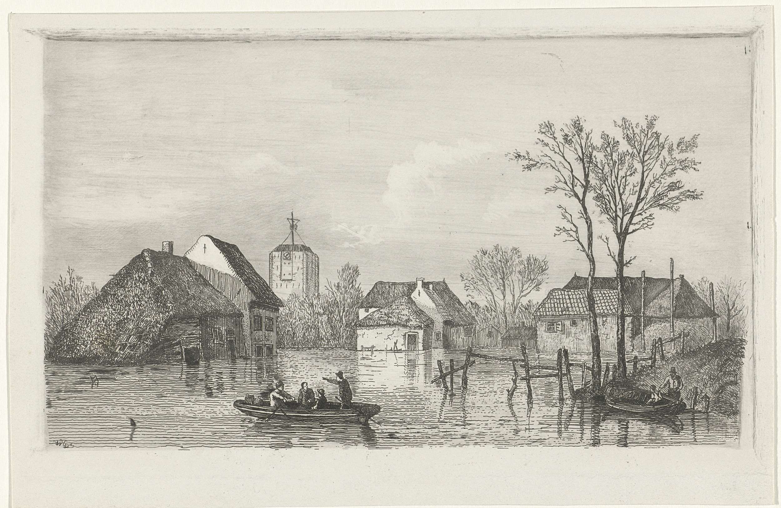 Landschap met overstroming bij Beesd in 1855. Op de achtergrond zijn ondergelopen boerderijen en de kerktoren van Beesd zichtbaar.