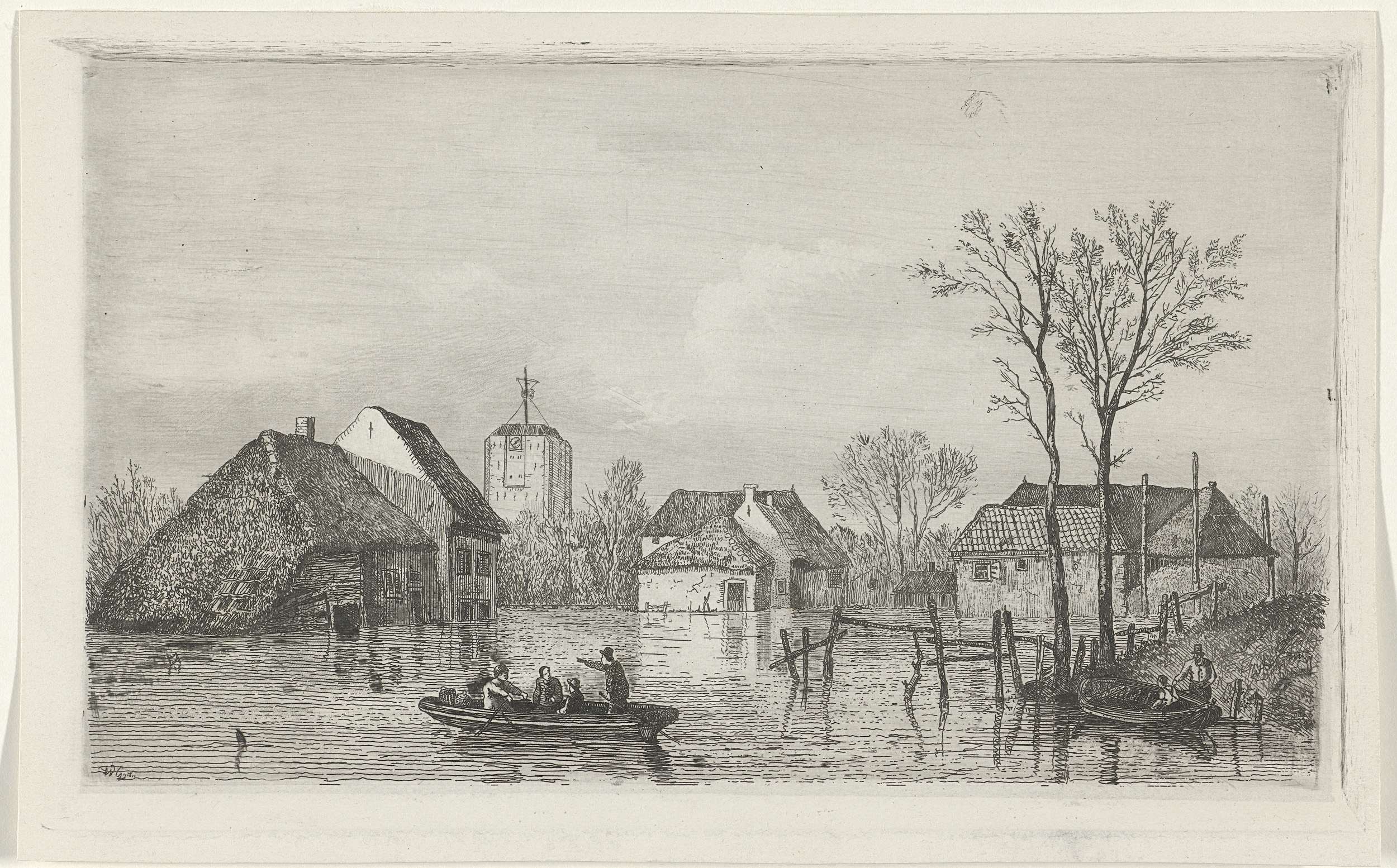 Landschap met overstroming bij Beesd in 1855. Op de achtergrond zijn ondergelopen boerderijen en de kerktoren van Beesd zichtbaar.
