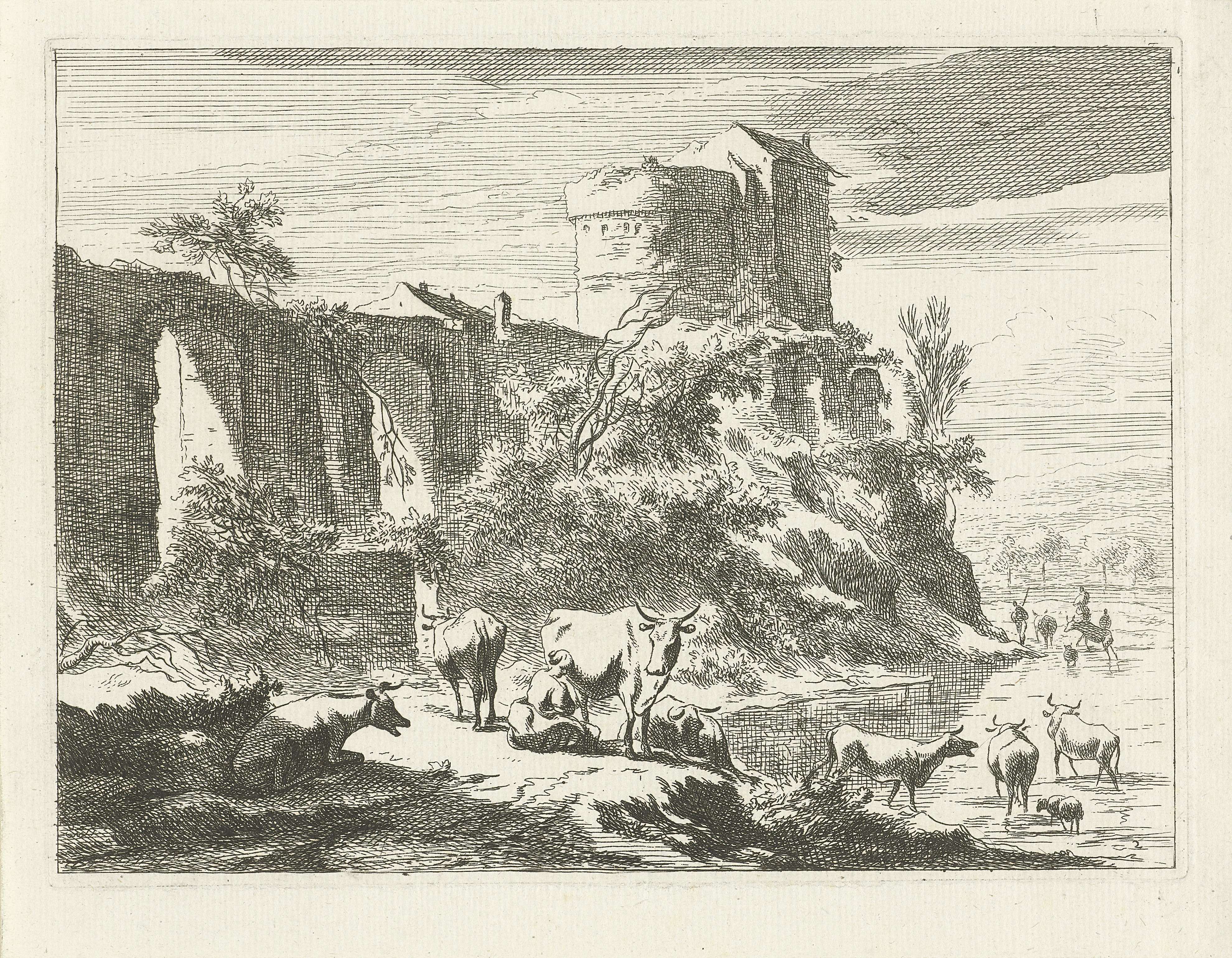 Landschap met ruïne en rots aan het water. Op de voorgrond een koe melkende vrouw zittend tussen vee. Rechts herders en koeien wadend in het water. Tweede prent uit een serie van zes met landschappen met herders en vee.