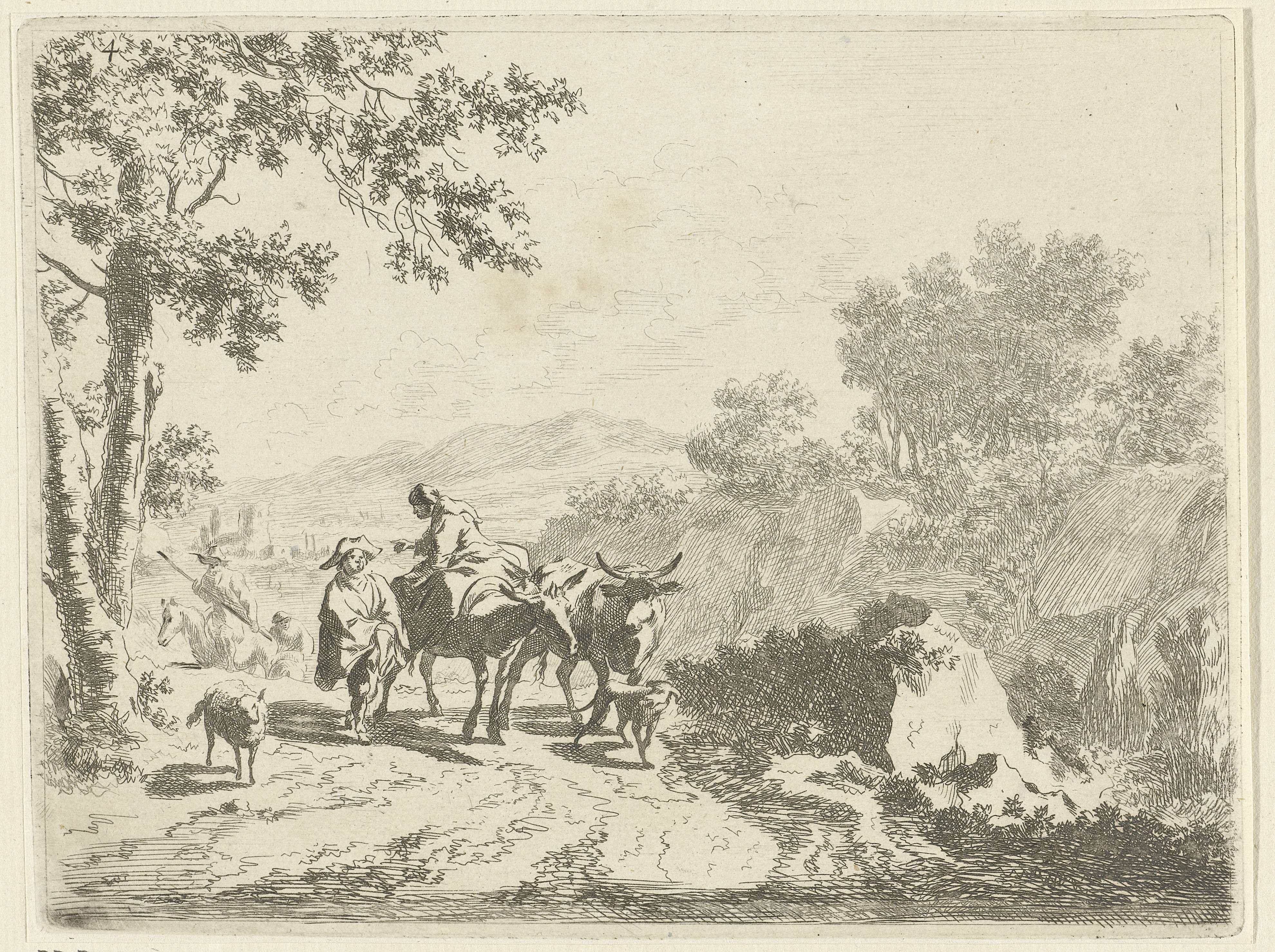 Heuvelachtig landschap met links een pad met wee herders met vee en een herderin zittend op een ezel. Vierde prent uit een serie van vier met landschappen met herders en vee.