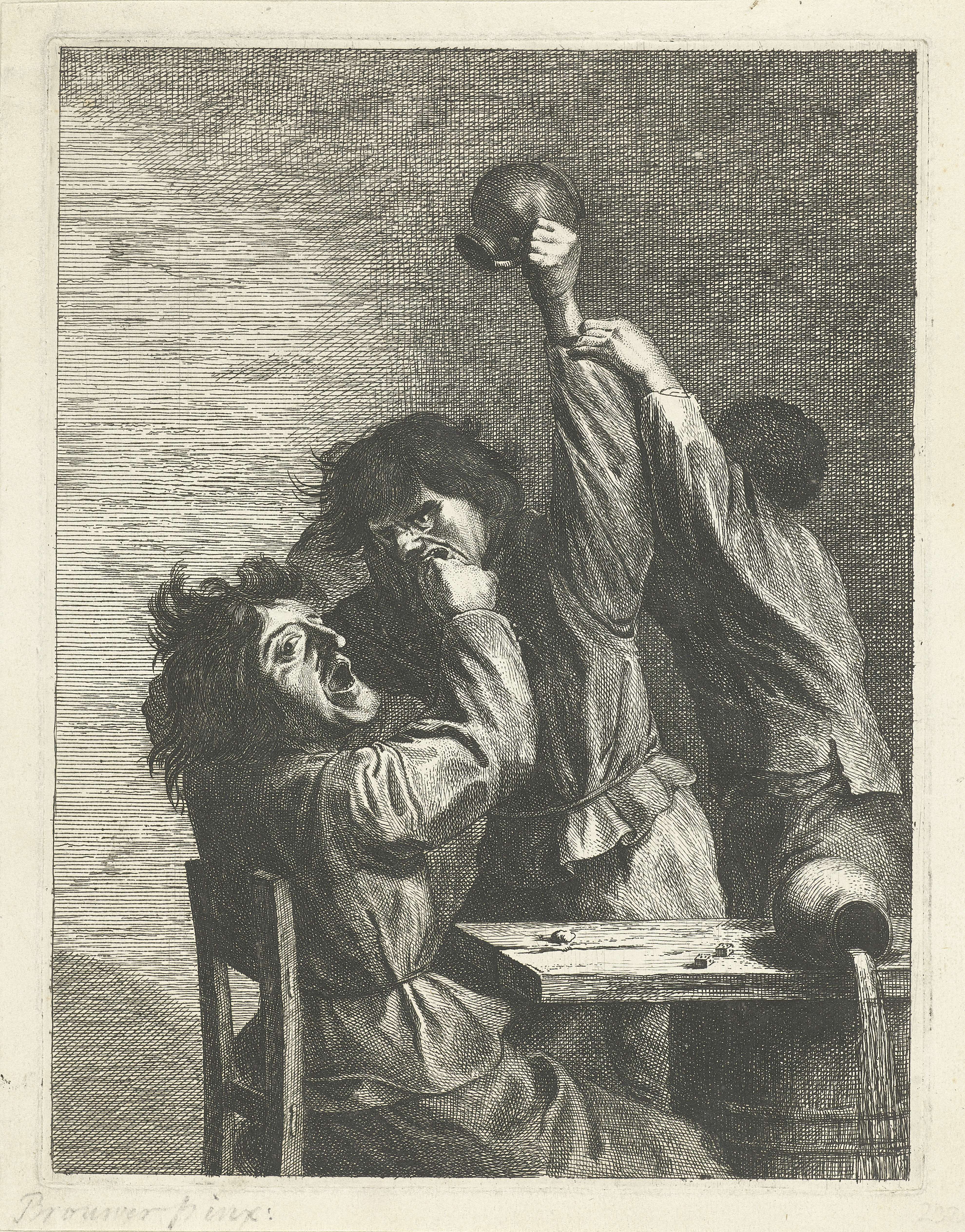 Herberginterieur met drie vechtende boeren van wie een, zittend aan een tafel, in zijn hand gebeten wordt. De bijtende boer heeft een kruik in zijn handen. De derde boer probeert hem tegen te houden. Rechts op de tafel een omgevallen kruik.