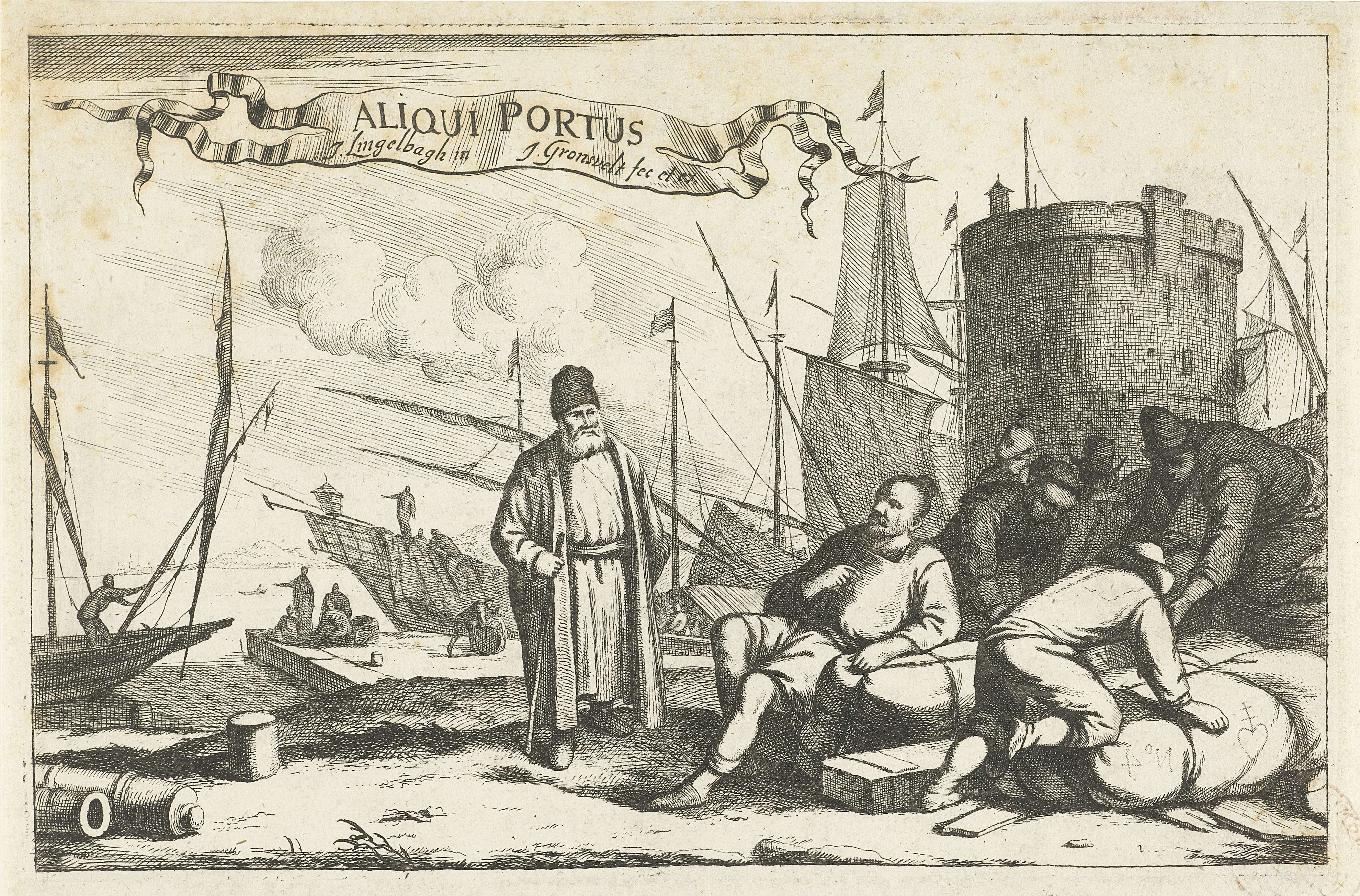 Haven met op de voorgrond twee buitenlandse kooplieden en rechts kooplieden in de weer met een lading. Op de achtergrond een toren en zeilschepen. Linksboven een banderol met de serietitel. Eerste prent uit een serie van twaalf met Italiaanse havens.