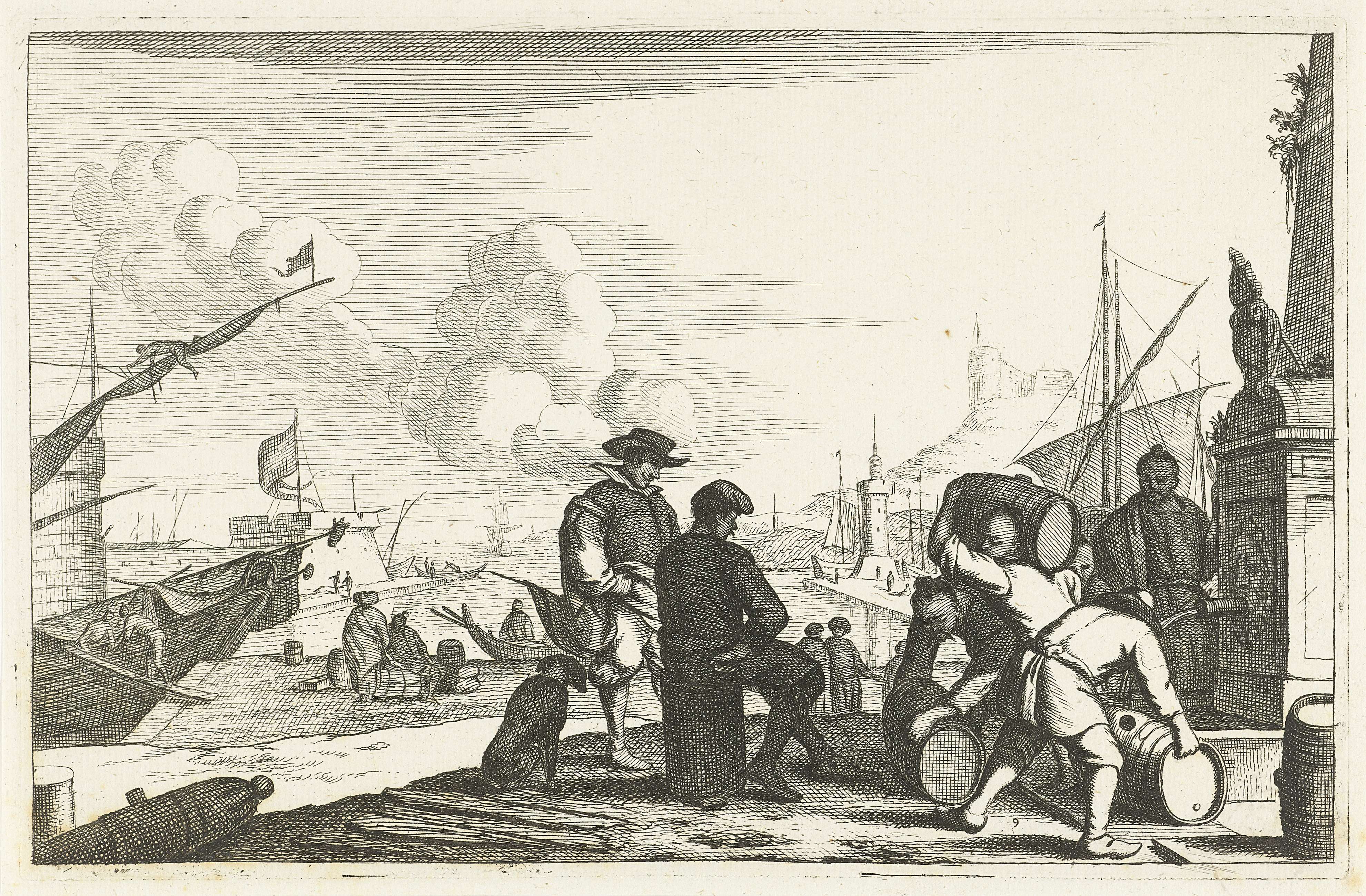 Haven met op de voorgrond twee kooplieden, links van hen een hond. Rechts van hen vier buitenlandse kooplieden bij een fontein in de weer met tonnen. Op de achtergrond een uitkijktoren op een heuvel. Negende prent uit een serie van twaalf met Italiaanse havens.