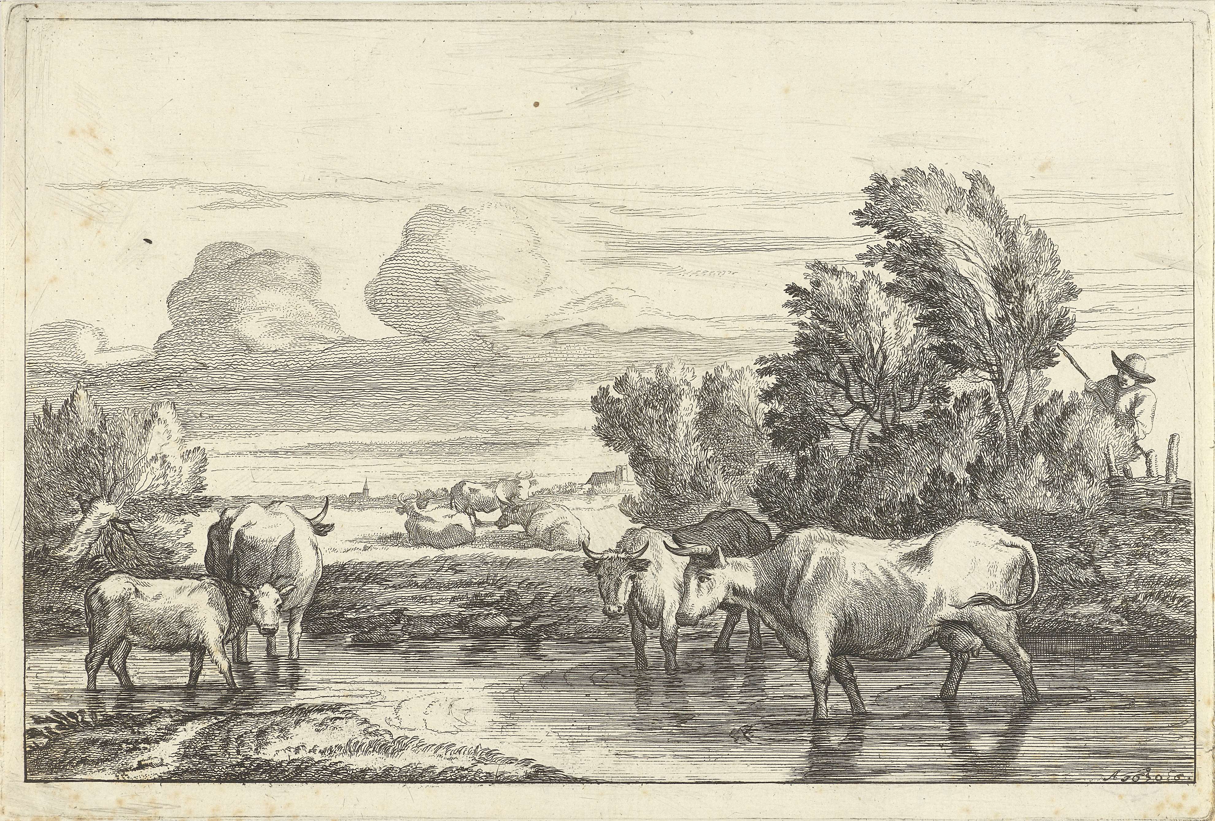 Landschap met vier koeien in een rivier en drie in de wei. Op de wal staat een herder gedeeltelijk verscholen achter een struik. Op de achtergrond een kerk.