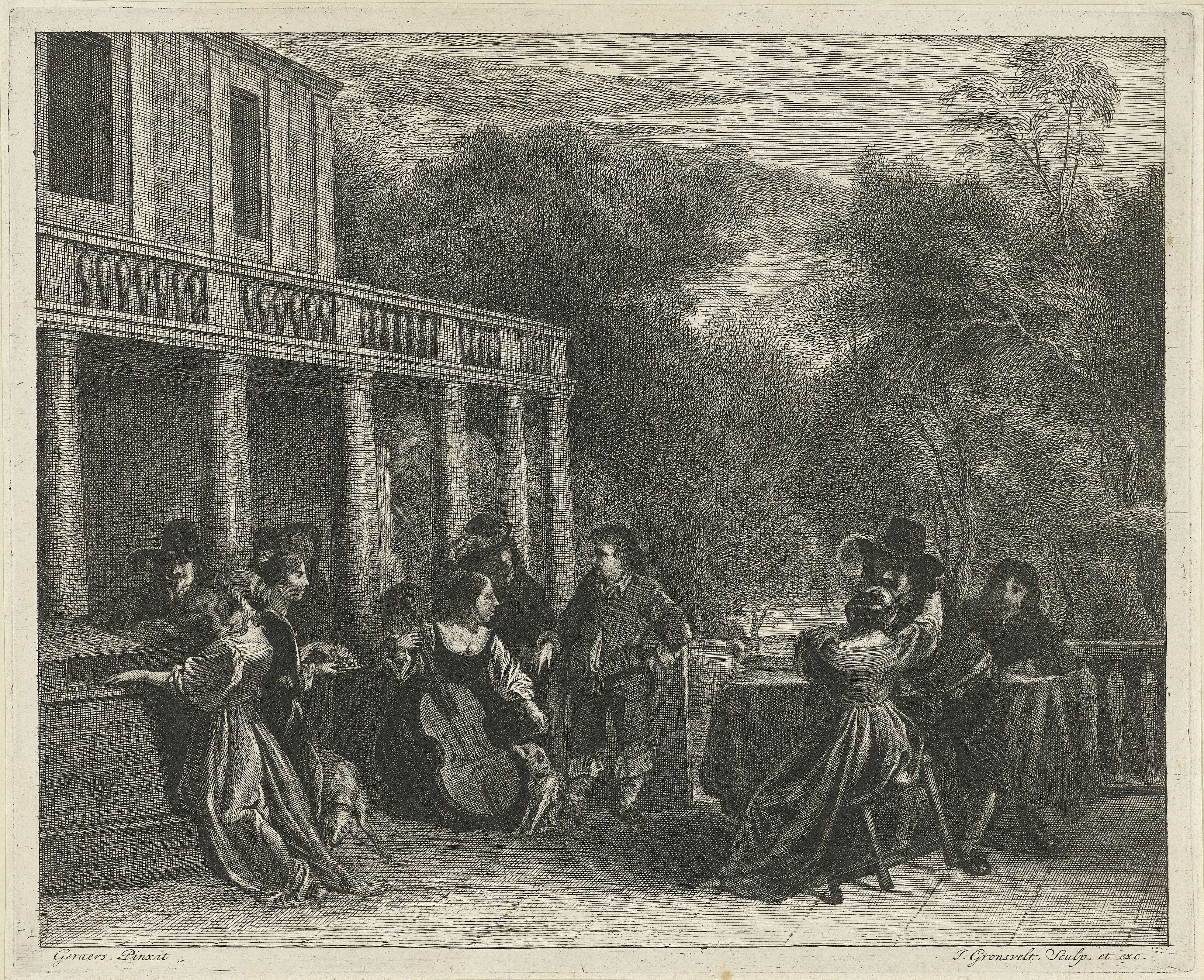 Musicerend gezelschap op bordes: links een vrouw spelend op een toetsinstrument en naast haar een vrouw spelend op een viola da gamba. Rechts een man en vrouw bij een tafel, elkaar omhelzend.