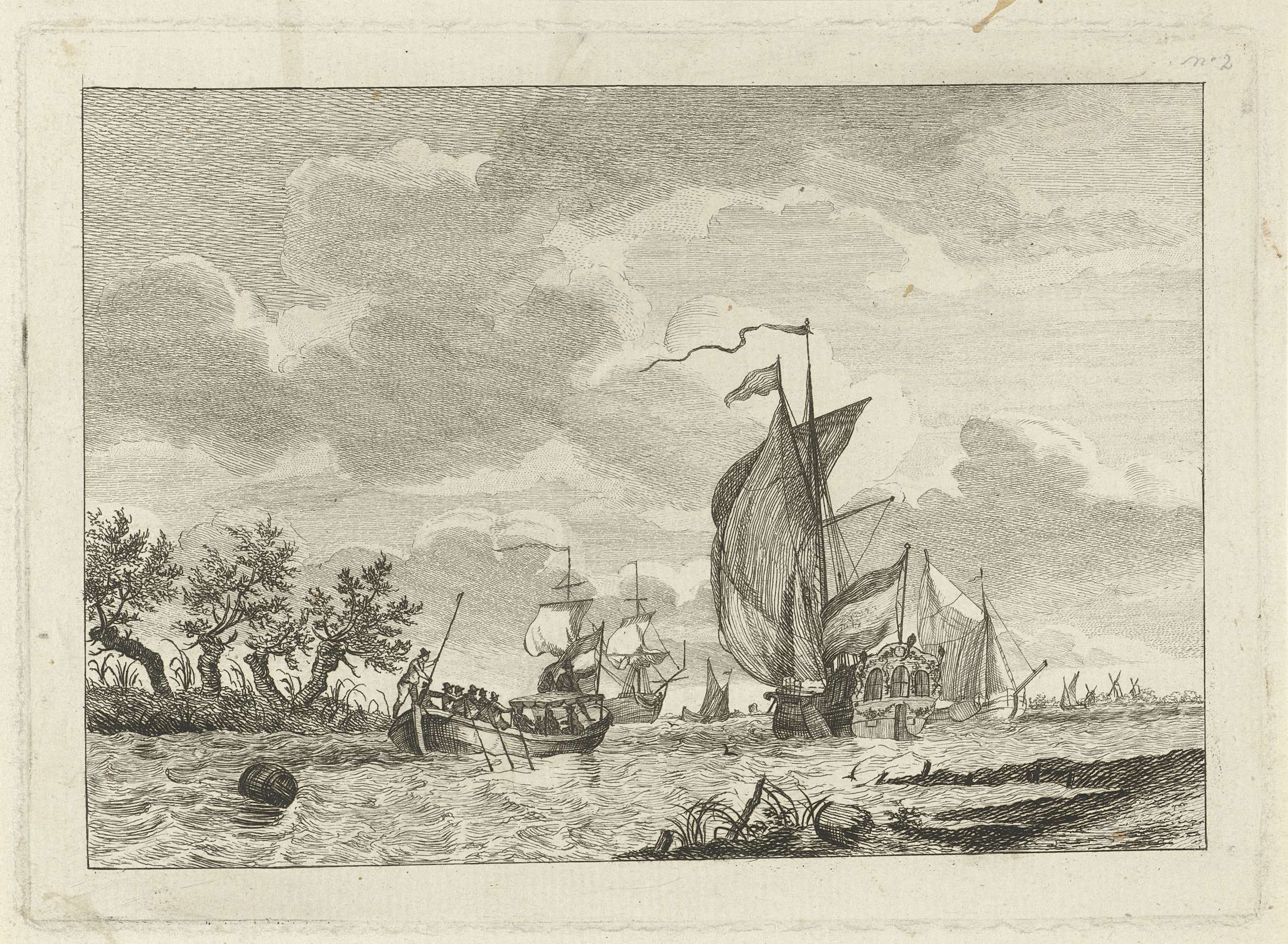 Riviergezicht met een roeiboot op de voorgrond en met links aan de wal enkele knotwilgen. Op de achtergrond verschillende schepen.