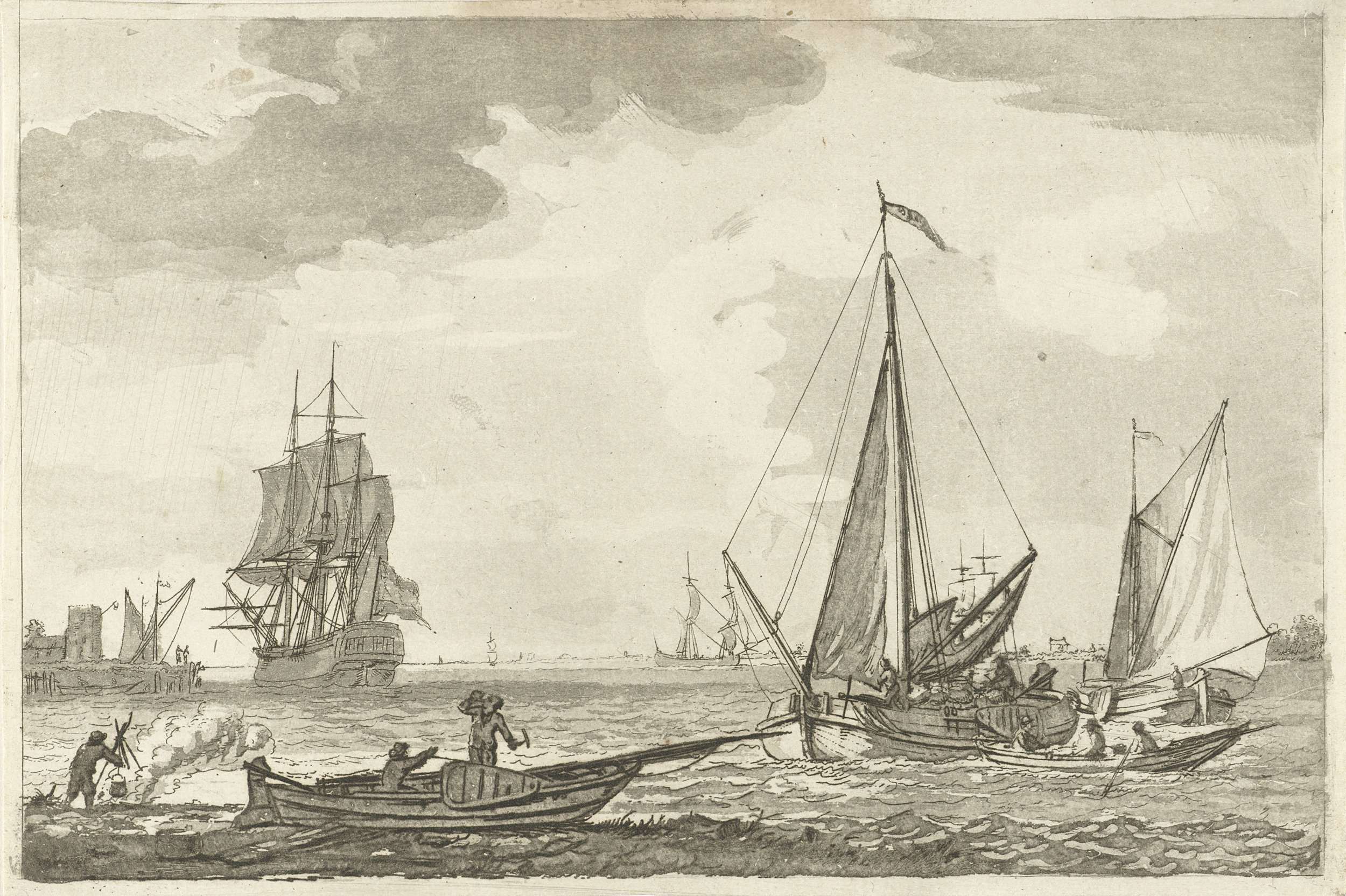 De bevoorrading van een schip en verschillende schepen op het water. Links aan de oever staat een figuur die een pot boven een vuur heeft hangen. Deze prent maakt deel uit van een serie van zes prenten met verschillende schepen.