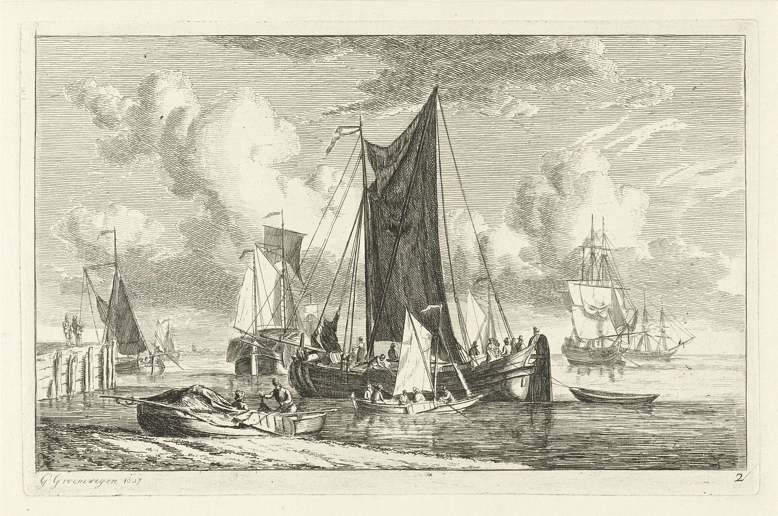 Verschillende zeilschepen op stil water. Links op de voorgrond ligt een boot op het strand. Een van de twee mannen aan het strand heeft een visnet in zijn handen. Deze prent maakt deel uit van een serie van zes prenten met diverse schepen.