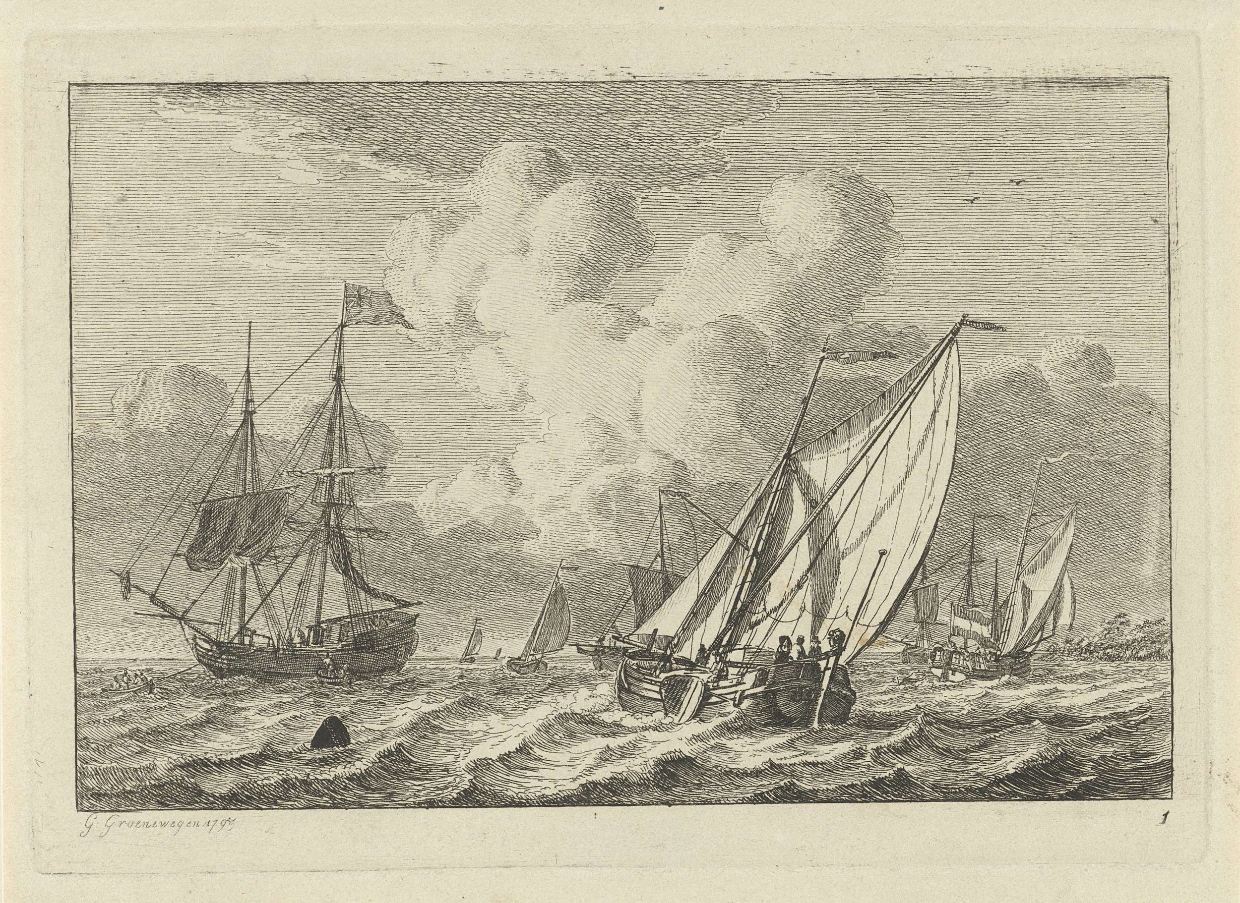 Verschillende zeilschepen op woelig water. Deze prent maakt deel uit van een serie van zes met verschillende zeilschepen op het water.