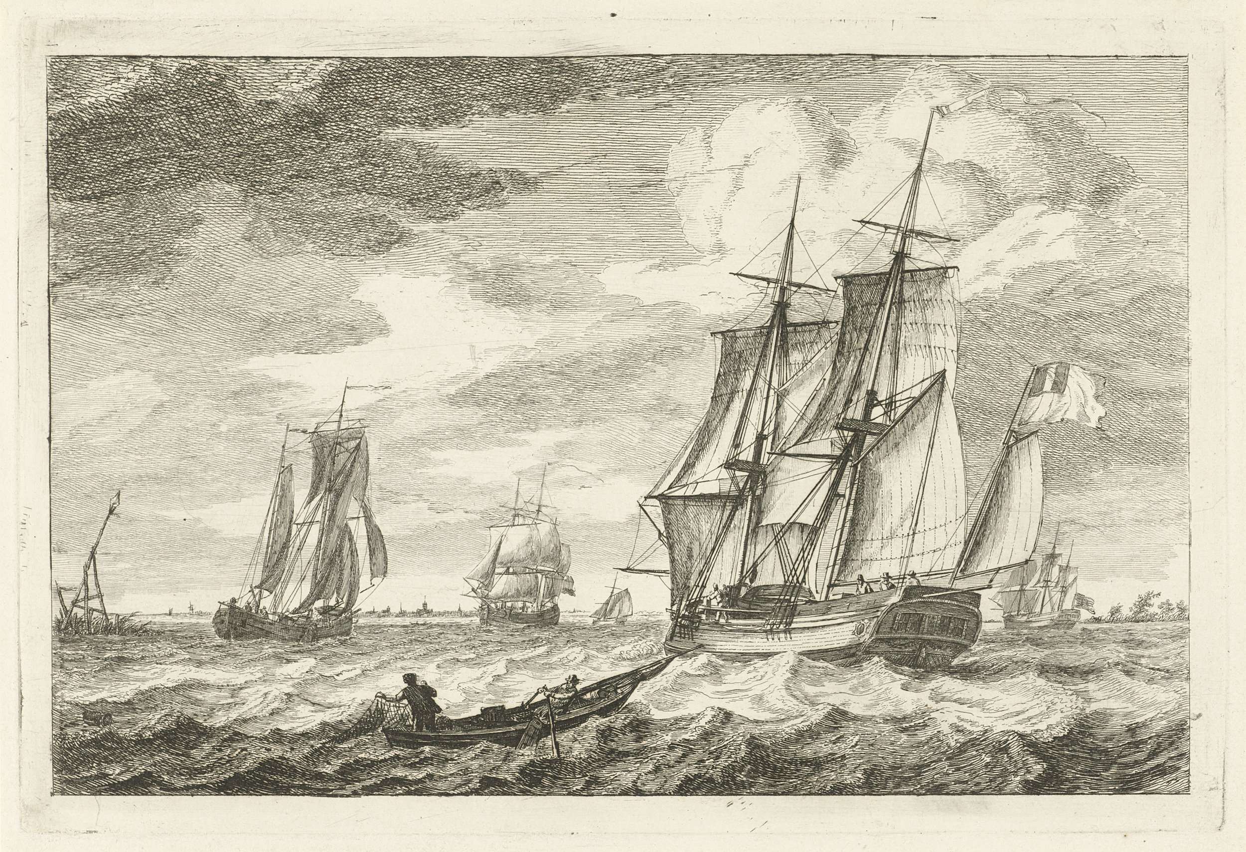 Zeegezicht met zeilschepen en op de voorgrond een sloep met twee figuren. Door een van de mannen in de sloep wordt geroeid, terwijl de andere een visnet uitwerpt bij het roer. Deze prent maakt deel uit van een serie van vijf prenten met verschillende zeilschepen.