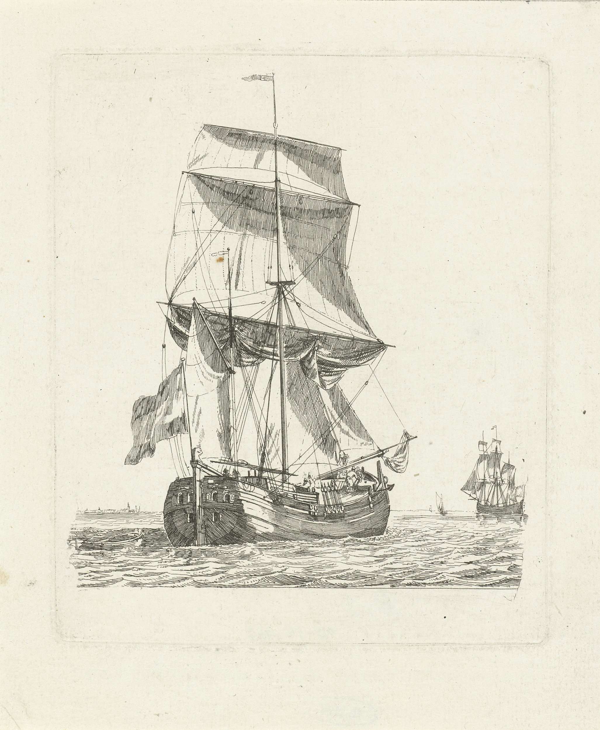 Zeilschip op open water van achter gezien. Rechts op de achtergrond liggen twee andere zeilschepen. Links op de achtergrond zijn de contouren van een kerk en een dorp of stad te zien. Deze prent is deel van een serie van twaalf prenten met boten.