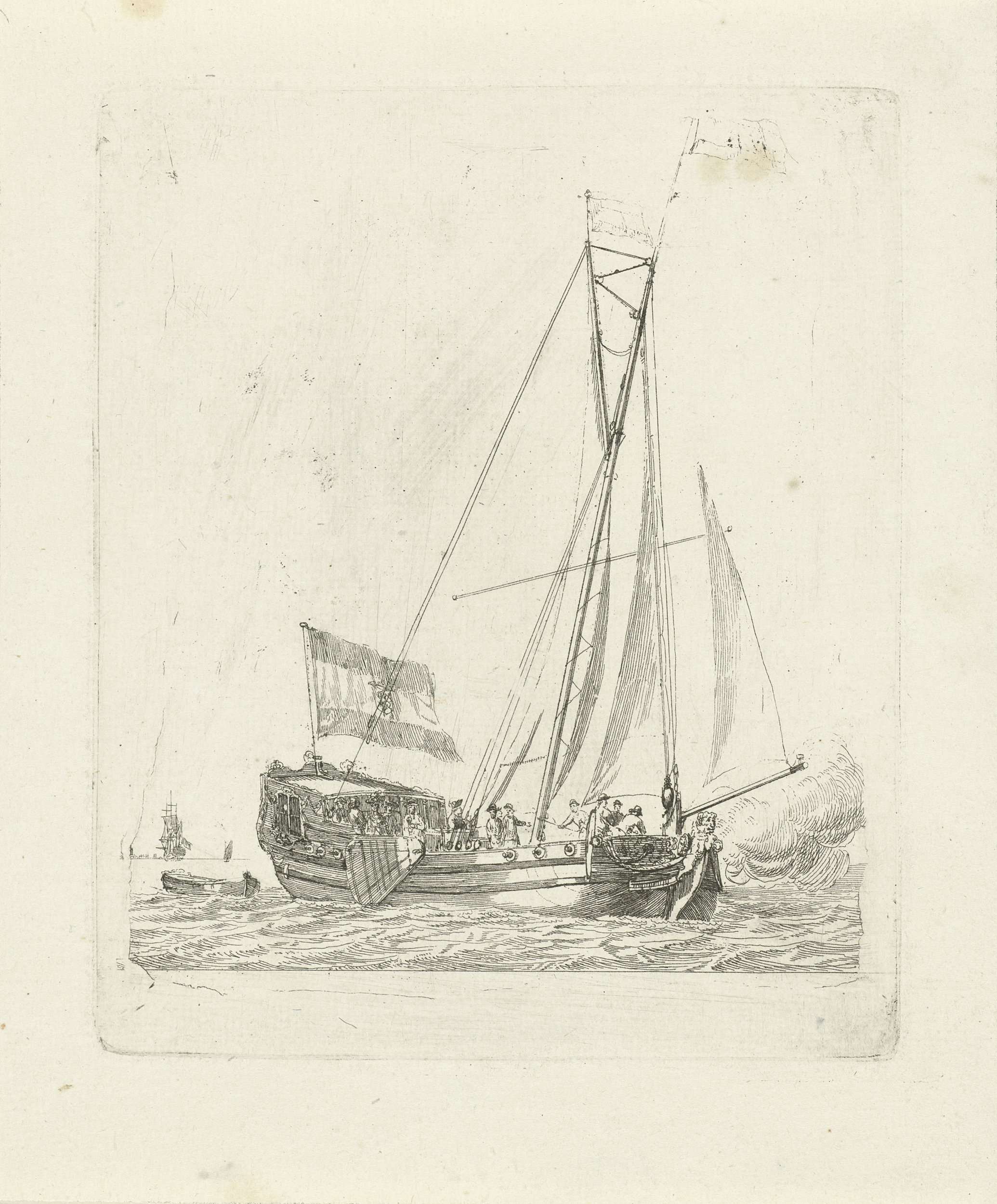 Zeilschip met meerdere figuren. Vanaf de boot wordt een kanonschot gelost. Links van de boot drijft een sloep en op de achtergrond zijn twee andere boten zichtbaar. Deze prent maakt deel uit van een serie van twaalf prenten met verschillende zeilschepen.