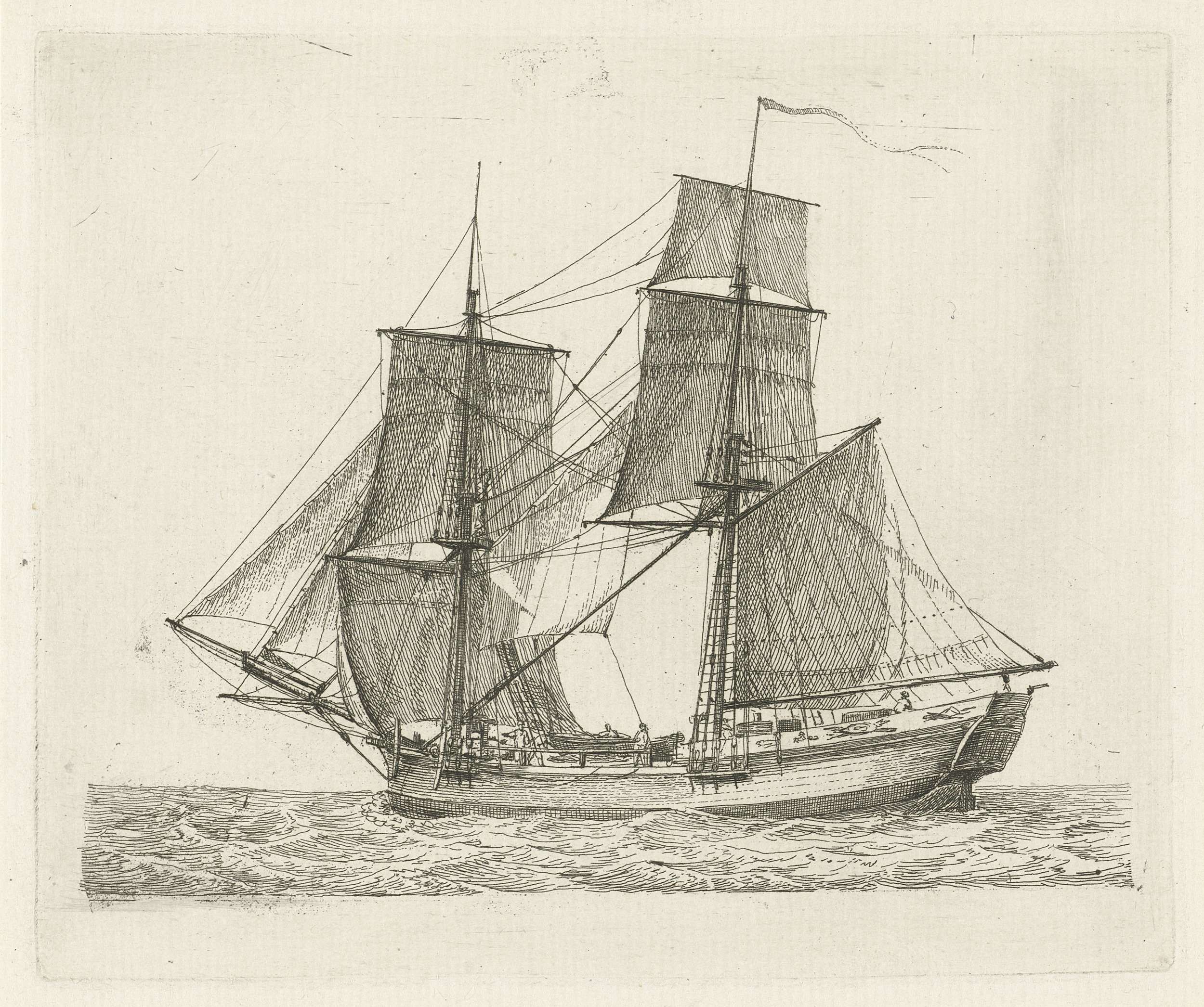 Een tweemaster met figuren, naar links varend. Deze prent maakt deel uit van een serie van twaalf prenten met verschillende zeilschepen.