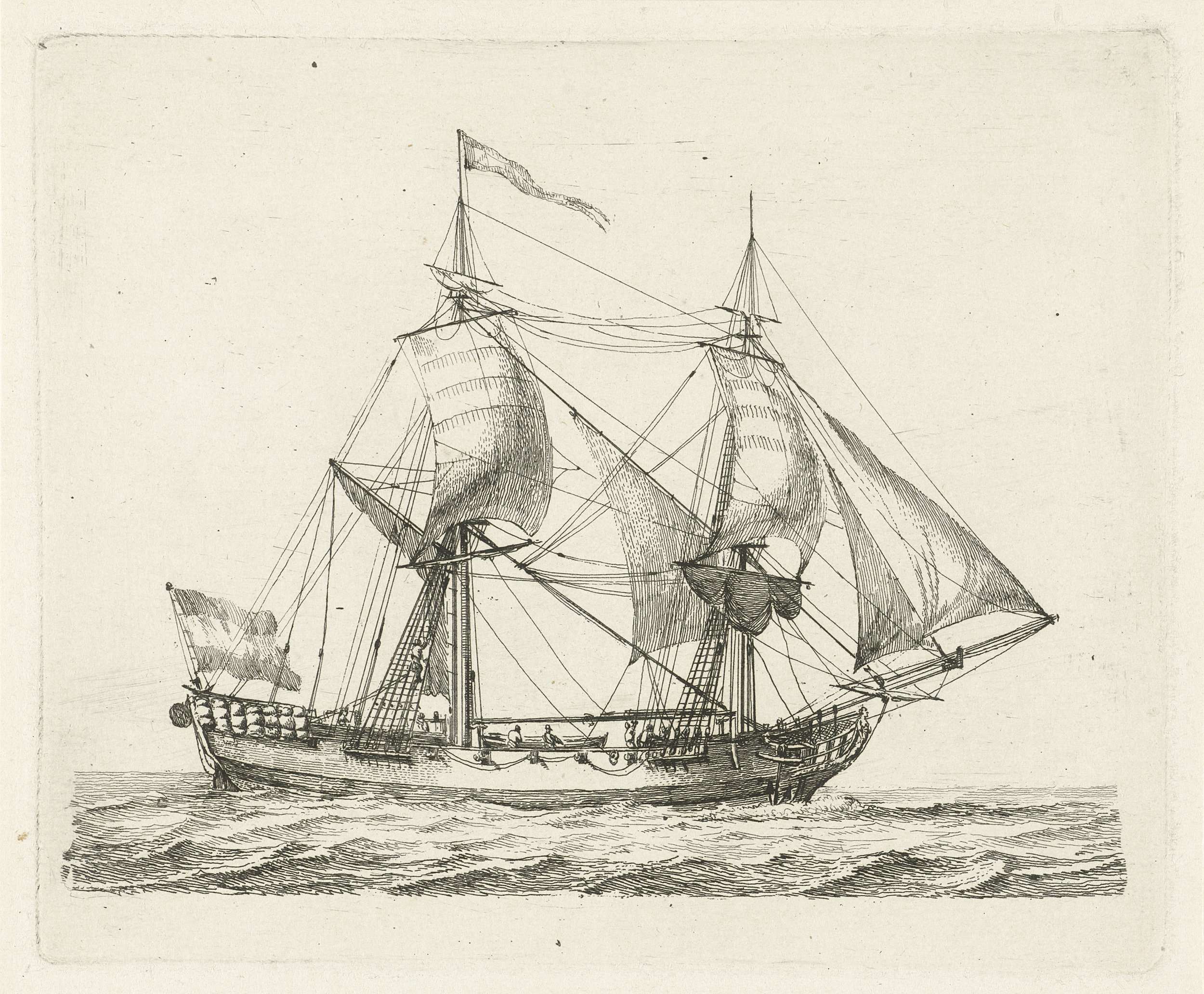 Een tweemaster met een vlag en figuren. Deze prent maakt deel uit van een serie van twaalf prenten met verschillende zeilschepen.