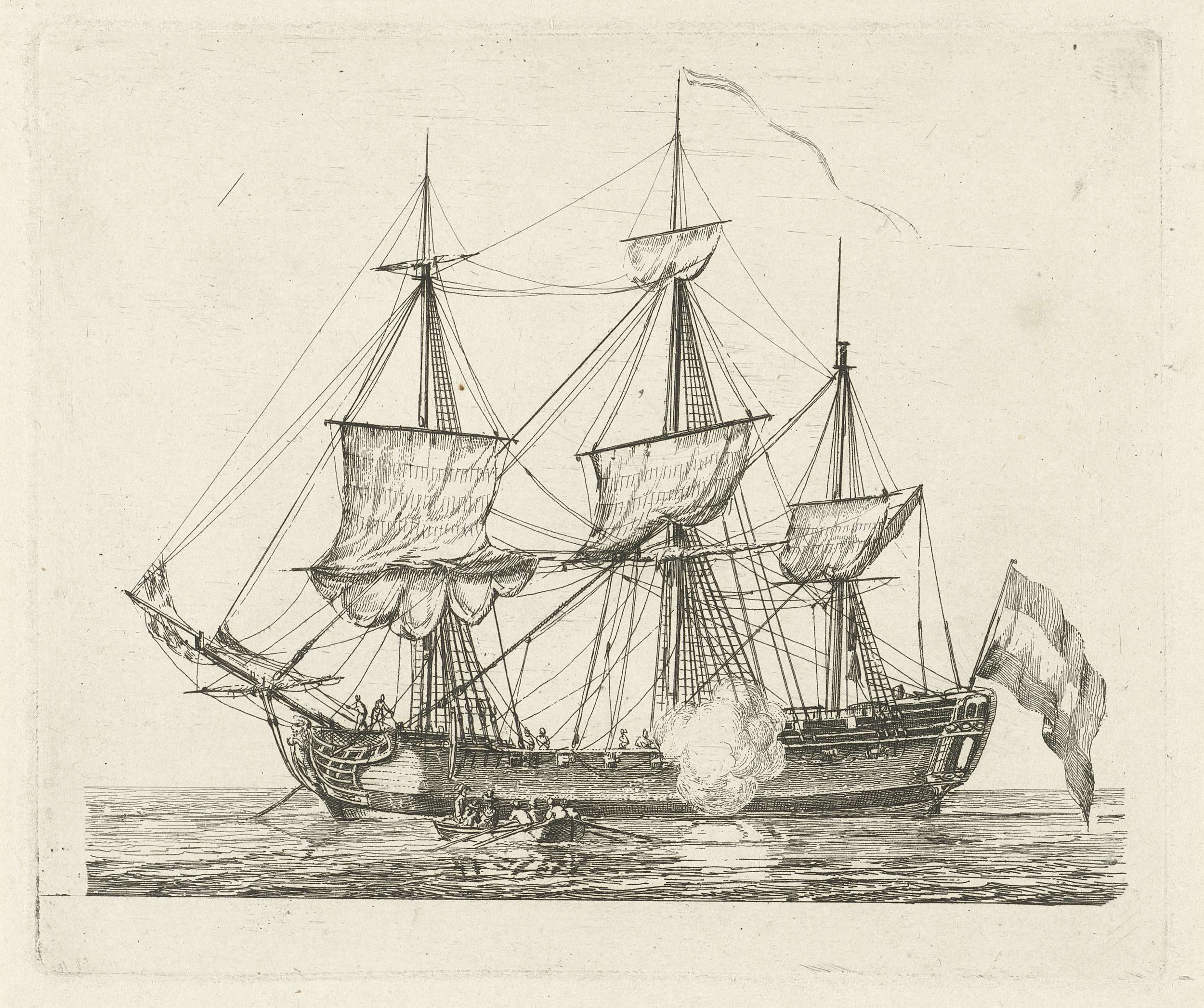 Een driemaster met figuren en een vlag, naar links varend. Naast de driemaster ligt een roeiboot met figuren in het water. Er wordt een schot gelost. Deze prent maakt deel uit van een serie van twaalf prenten met verschillende zeilschepen.