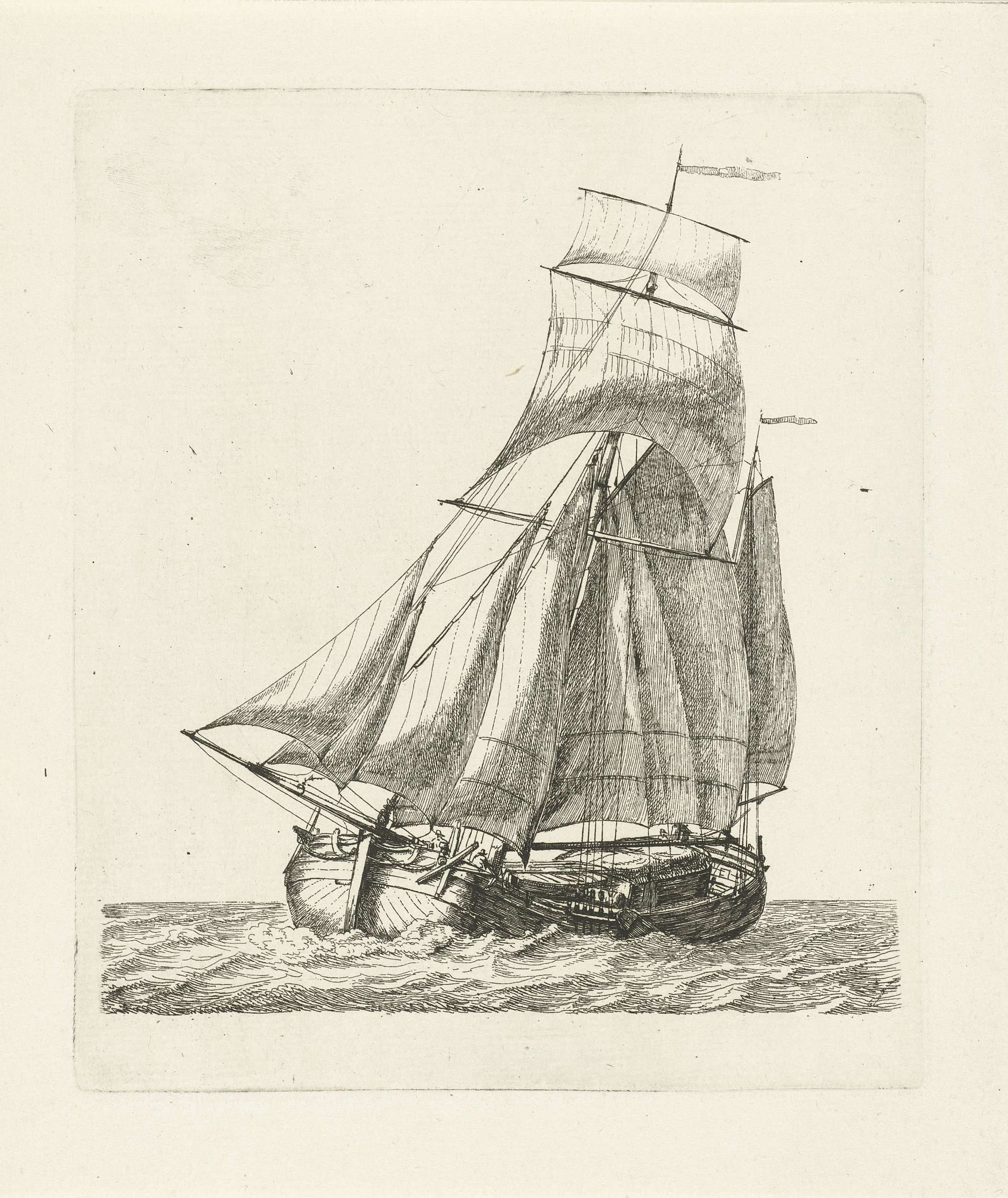 Een zeilschip met drie figuren, schuin van voren gezien. Deze prent maakt deel uit van een serie van twaalf prenten met verschillende zeilschepen.