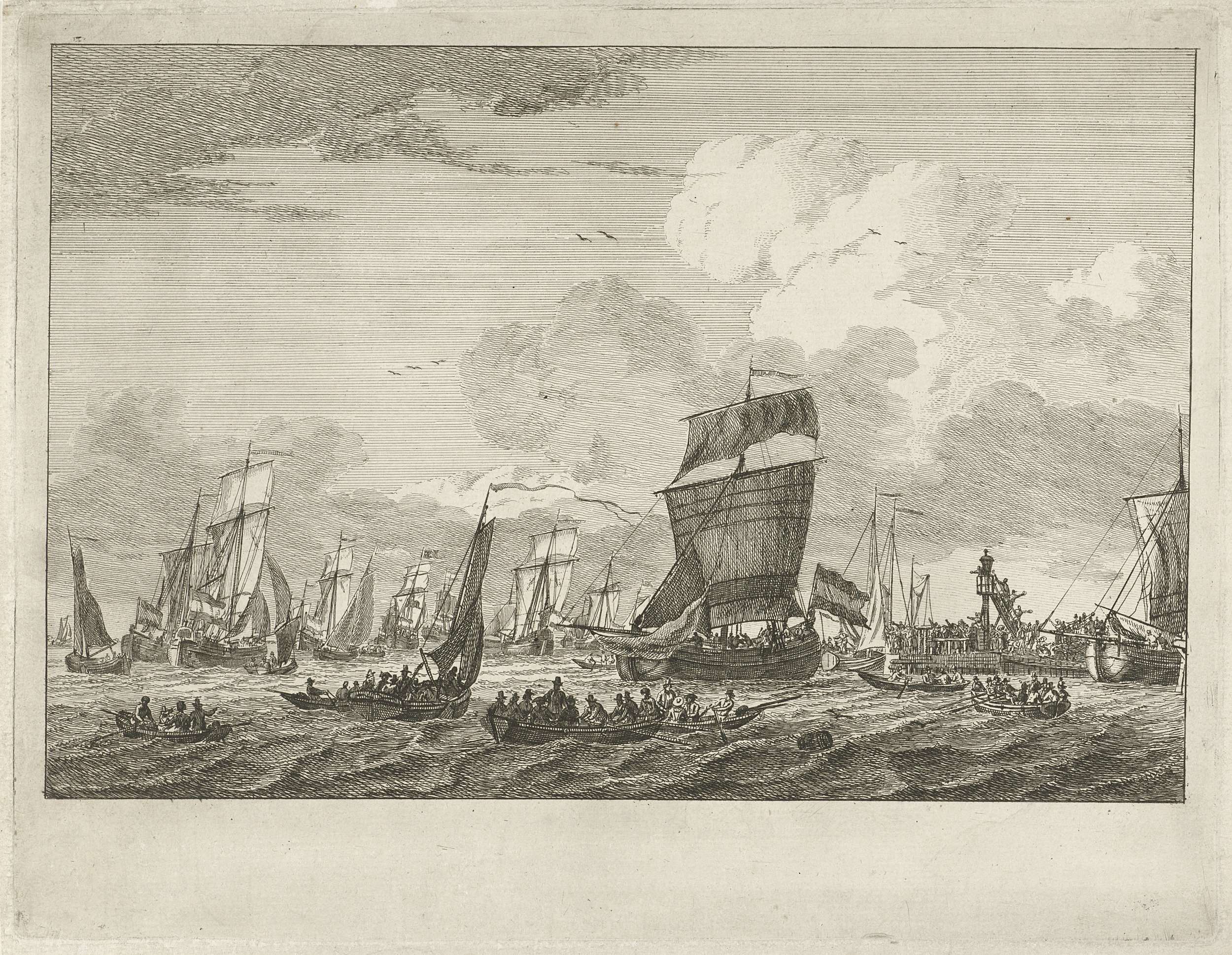 Op een overvolle pier in Vlaardingen staan vele mensen naar de uitvarende sloepen, vissersboten en zeilschepen te zwaaien.