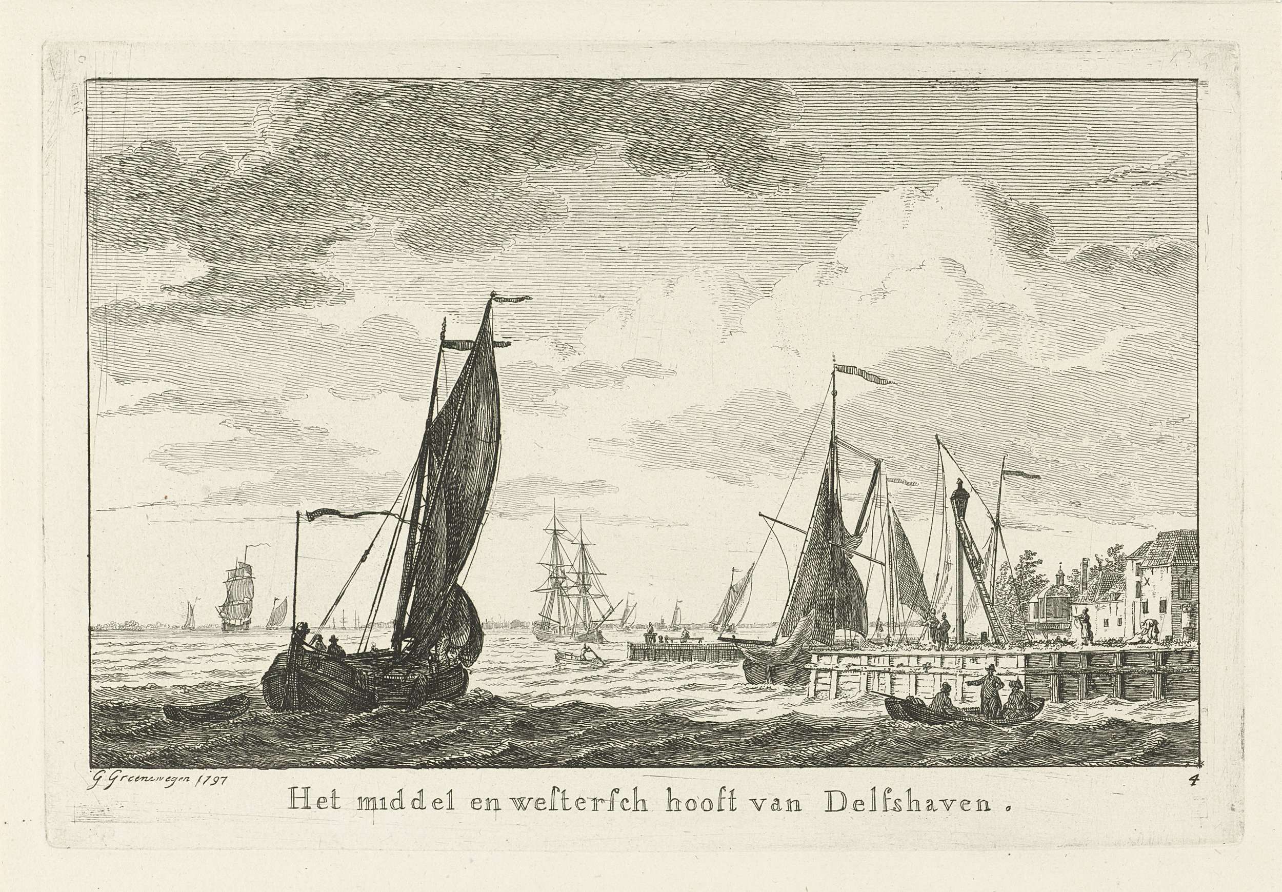 Gezicht op de Maas en het middelste (vooraan) en westelijke havenhoofd (daarachter) van Delfshaven, gezien vanuit het oosten. Op de voorgrond een roeiboot en een zeilschip. Rechts enkele boten die aan de steiger liggen en twee vrouwen die kleding wassen. Rechtsonder genummerd: 4. Deze prent maakt deel uit van een serie van zes prenten met ...