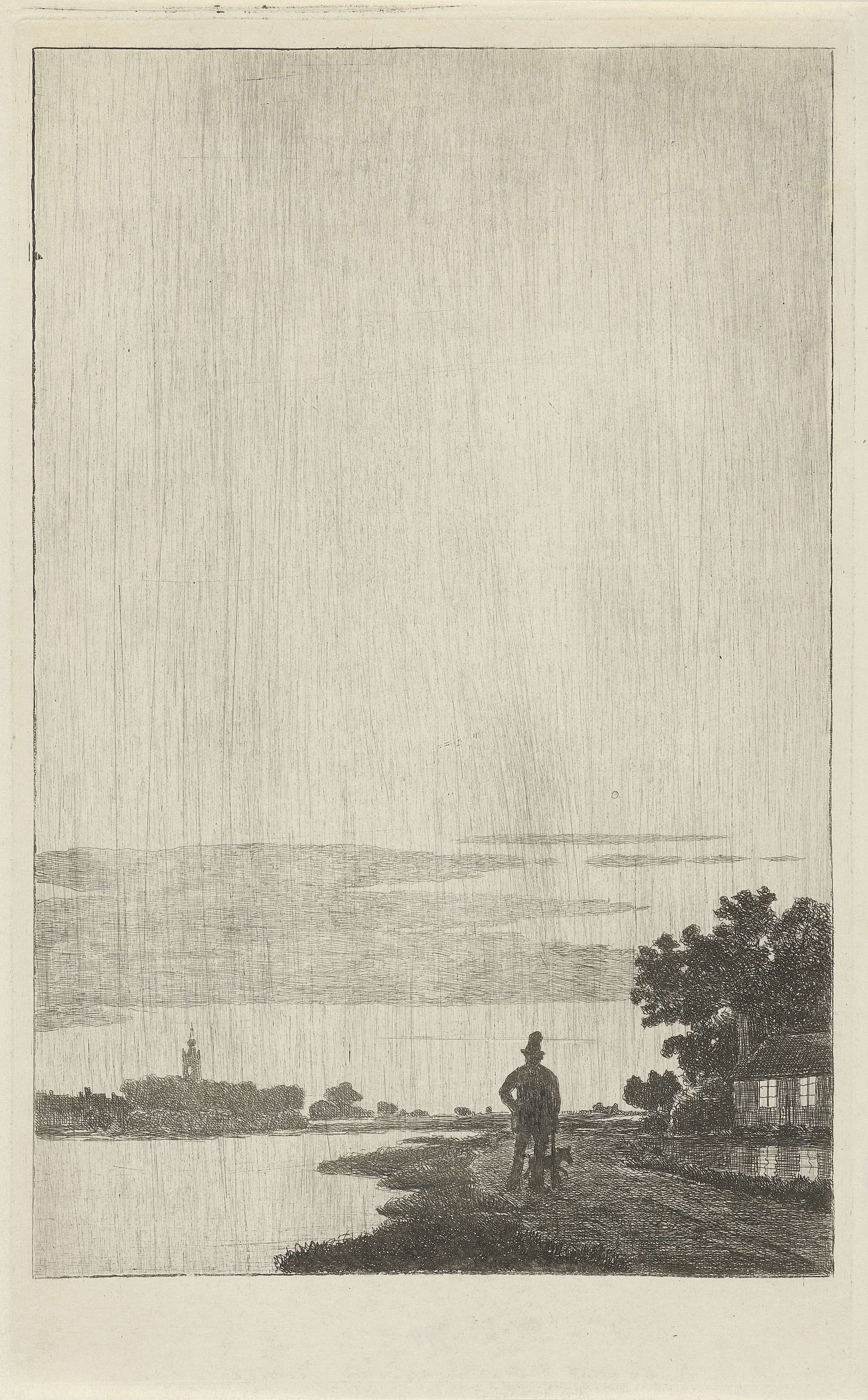 Op de voorgrond een man met hond bij een rivier. Op de achtergrond links een kerktoren. Voor de komeet.