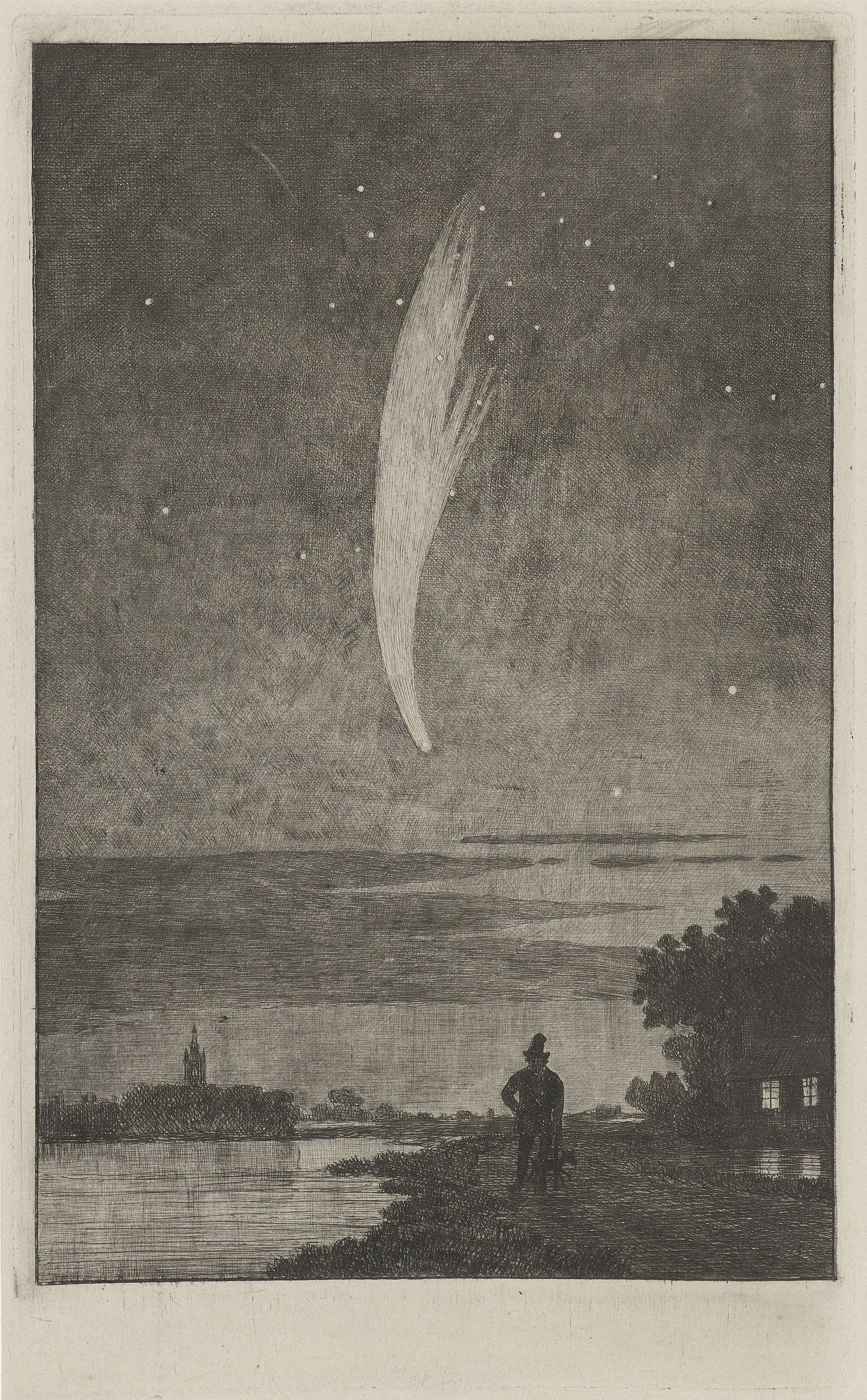 De komeet van Donati, 10 oktober 1858. Op de voorgrond een man met hond bij een rivier. Op de achtergrond links een kerktoren.