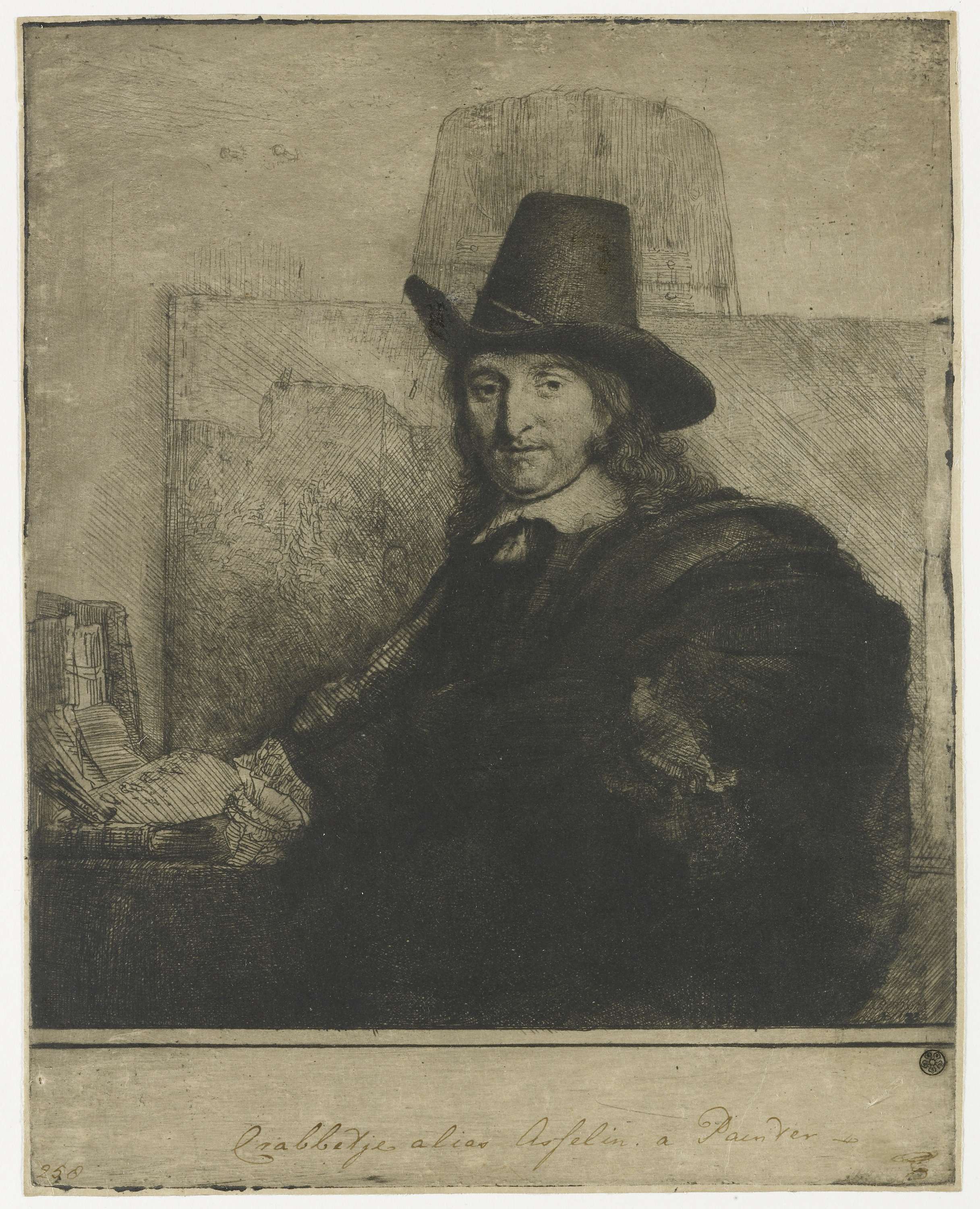 Met de linkerhand in de zij en een zelfverzekerde blik poseert de schilder Jan Asselijn voor een van zijn doeken. Zijn specialismen waren Italiaanse landschappen en stadsgezichten, maar met de boeken op het tafeltje links laat hij weten ook belezen te zijn. Dit portret is een van de eerste etsen die Rembrandt afdrukte op kostbaar ...