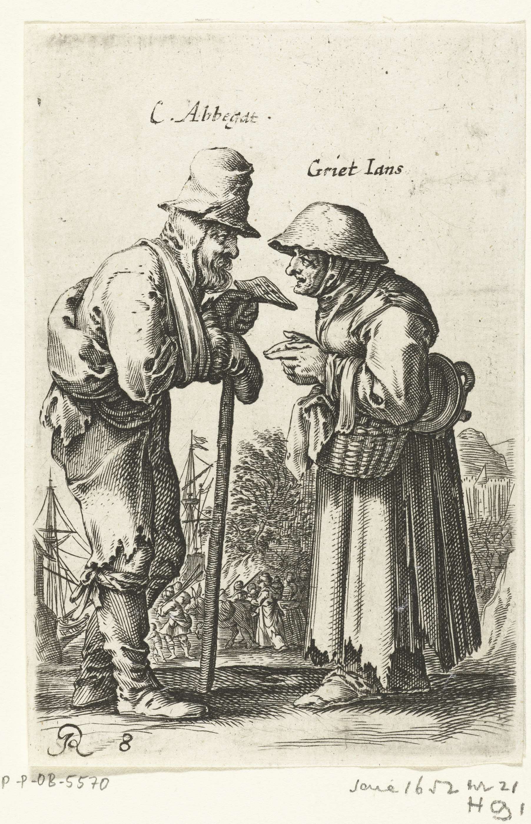 Twee staande oude bedelaars, een man en een vrouw, met elkaar in gesprek. Op de achtergrond volk en soldaten bij schepen aan de kade. De prent maakt deel uit van een tiendelige serie met voorstellingen van bedelaars en boeren waarin ook verschillende ongelukkige figuren uit de Eerste Engelse Oorlog zijn opgenomen, ca. 1652-1654.