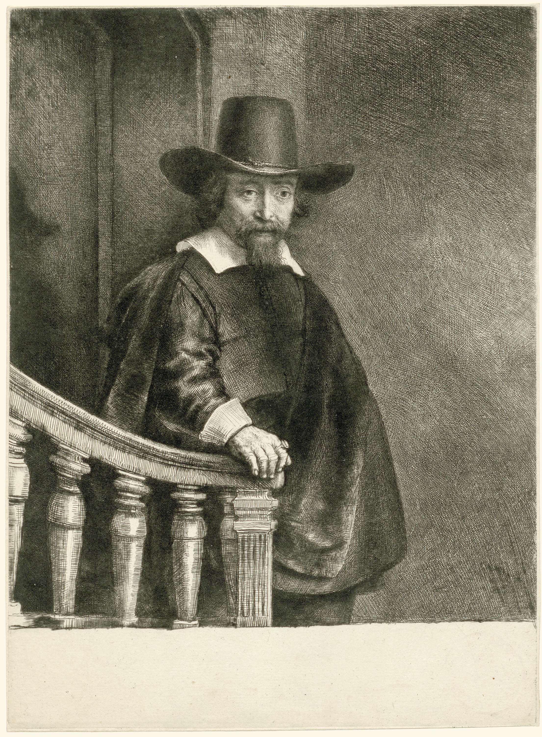 Het is opvallend dat het geëtste portret van Bueno meer van zijn omgeving toont dan de geschilderde voorstudie. Rembrandt deed veel moeite om in de prent de donkere tonen van de olieverfschets te vertalen. Toch onderscheidt hij de figuur nog altijd duidelijk van de achtergrond. De trap linksvoor fungeert als een van de lichtpunten in ...