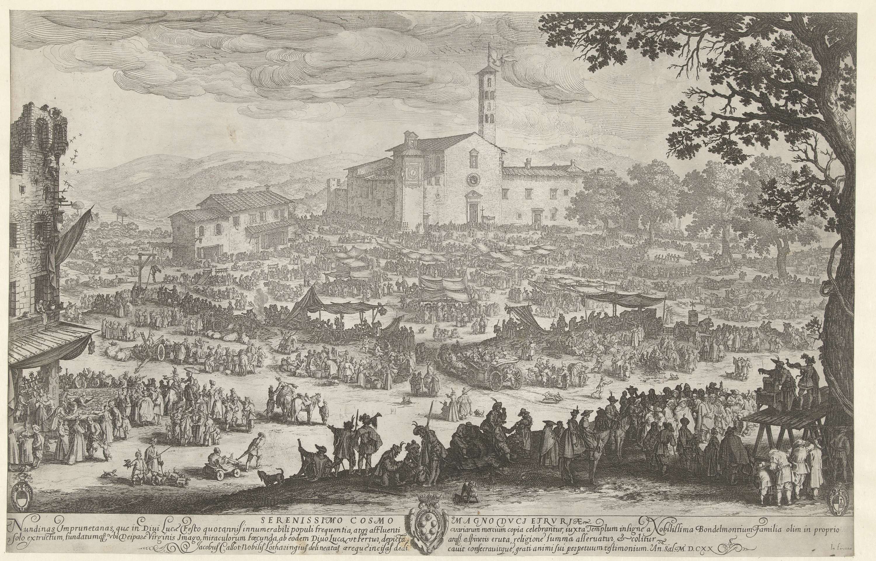 Jaarmarkt op 18 oktober te Impruneta, een dorp nabij Florence: een grote menigte kraampjes, handelaren en bezoekers op een plein voor een kerk. Linksonder het wapen van de Santa Mariakerk te Impruneta, rechtsonder het wapen van de familie Buondelmonti (die de kerk stichtte), middenonder het wapen van de Medici. Onder de voorstelling een onderschrift in ...