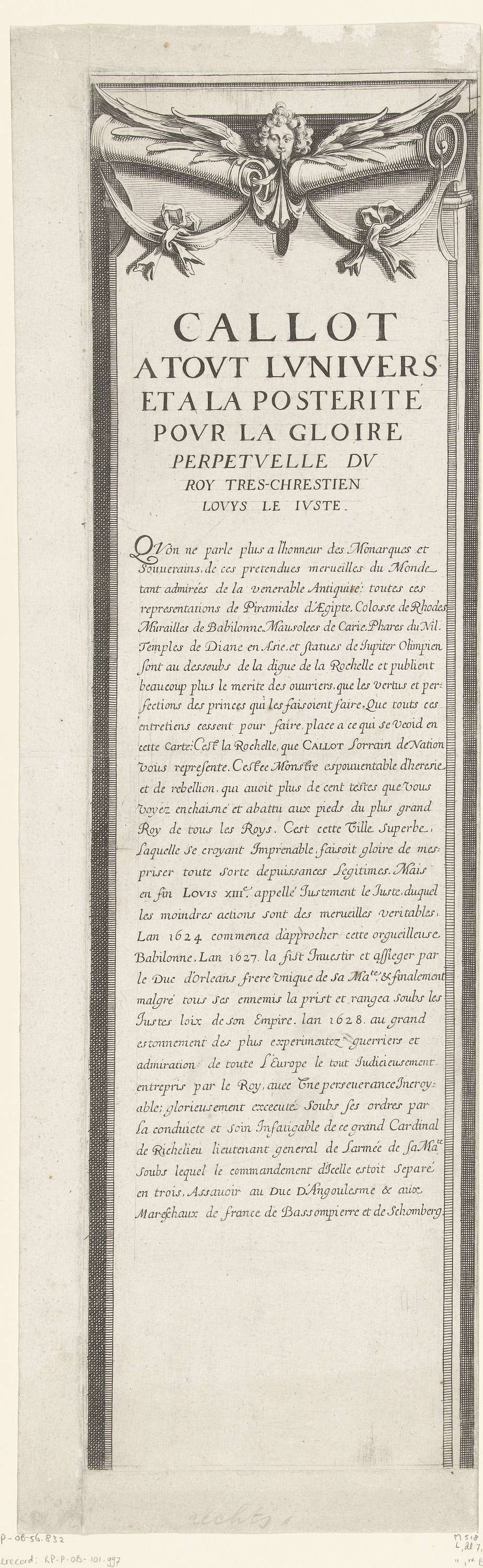Zestiende deel (tekst, deel linksboven) van een prent van het beleg van het hugenotenbolwerk La Rochelle in de jaren 1627 en 1628, dat werd uitgevoerd in opdracht van de Franse koning door het Franse leger onder aanvoering van kardinaal Richelieu. Op dit blad een algemene toelichting op het onderwerp van de prent, in het Frans.