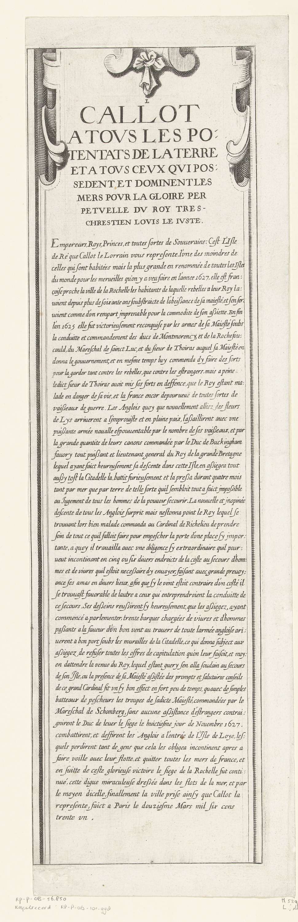 Zestiende deel (tekst, deel linksboven) van een prent van het beleg van de citadel Saint Martin op het Île de Ré in 1627, dat werd uitgevoerd door Engelse troepen onder leiding van de hertog van Buckingham en werd beëindigd door Franse troepen onder leiding van kardinaal Richelieu. Op dit blad een algemene toelichting op het ...