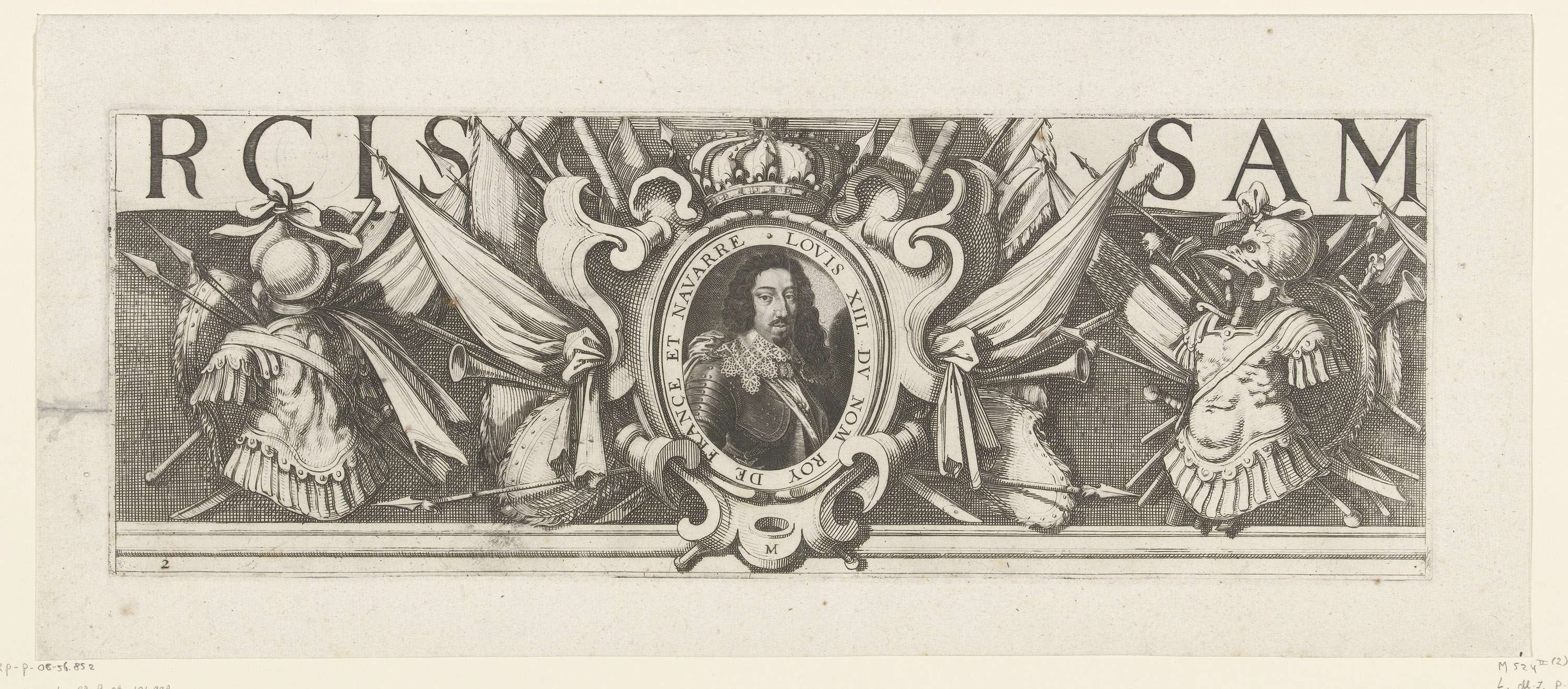 Zestiende deel (randwerk, deel middenboven) van een prent van het beleg van de citadel Saint Martin op het Île de Ré in 1627, dat werd uitgevoerd door Engelse troepen onder leiding van de hertog van Buckingham en werd beëindigd door Franse troepen onder leiding van kardinaal Richelieu. Op dit blad een portret van Lodewijk XIII ...