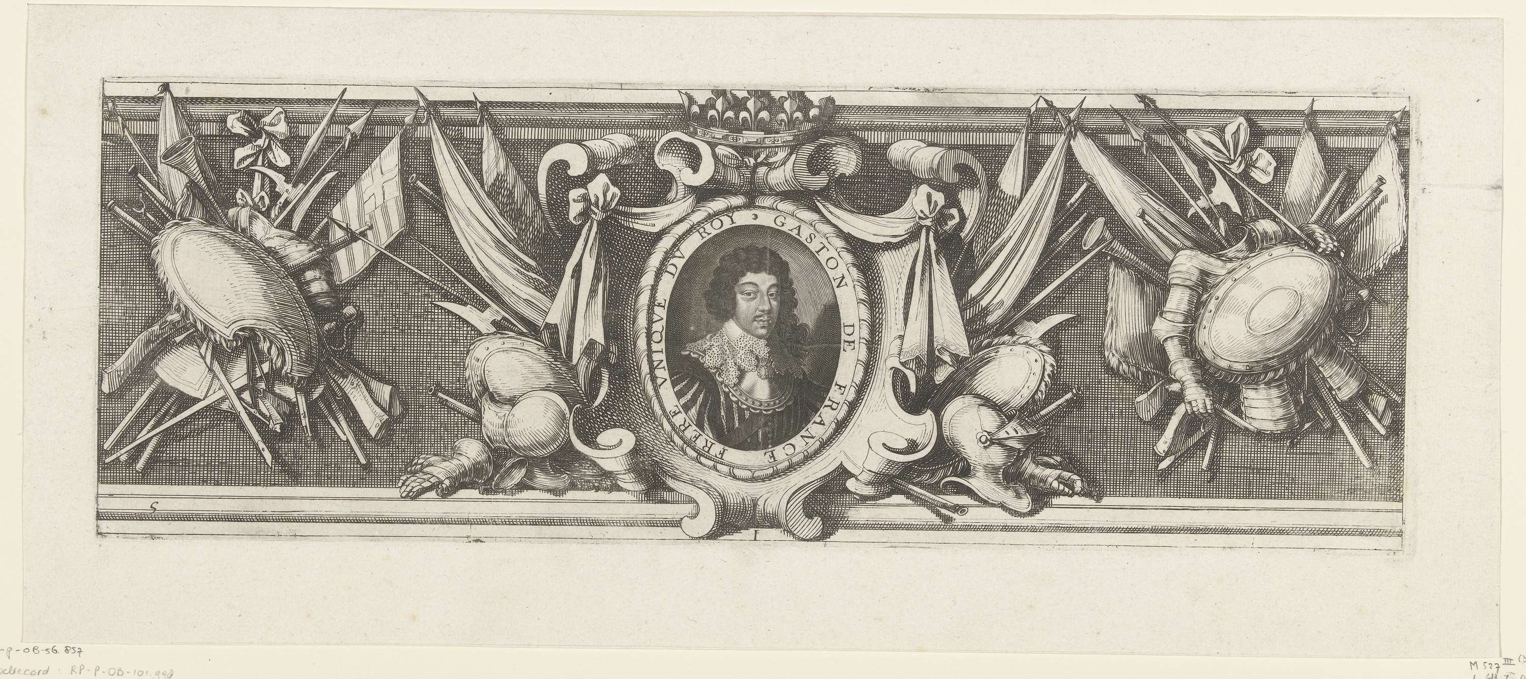 Zestiende deel (randwerk, deel middenonder) van een prent van het beleg van de citadel Saint Martin op het Île de Ré in 1627, dat werd uitgevoerd door Engelse troepen onder leiding van de hertog van Buckingham en werd beëindigd door Franse troepen onder leiding van kardinaal Richelieu. Op dit blad een portret van de broer ...