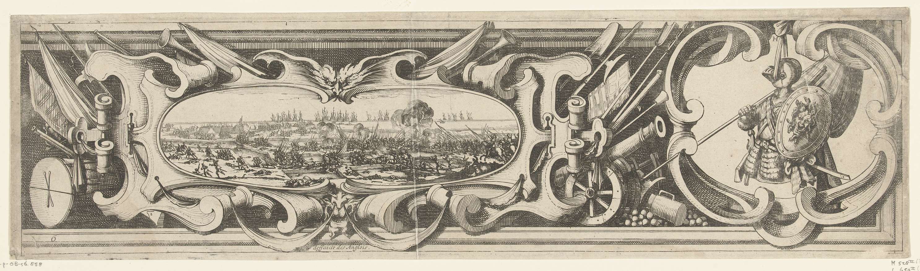Zestiende deel (randwerk, deel rechtsonder) van een prent van het beleg van de citadel Saint Martin op het Île de Ré in 1627, dat werd uitgevoerd door Engelse troepen onder leiding van de hertog van Buckingham en werd beëindigd door Franse troepen onder leiding van kardinaal Richelieu. Op dit blad rechts een harnas en midden/links ...